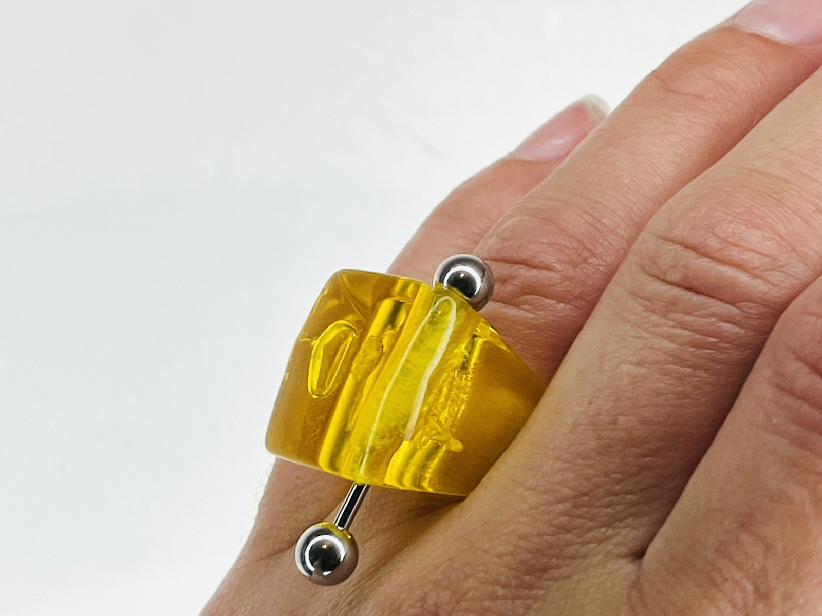 Bague en acrylique jaune transparente avec effet du bulle à l’intérieur, percé par un piercing en acier inoxydable qui bouge et fait du bruit avec le mouvement de la main ( pour les TDAH lol ) <3333