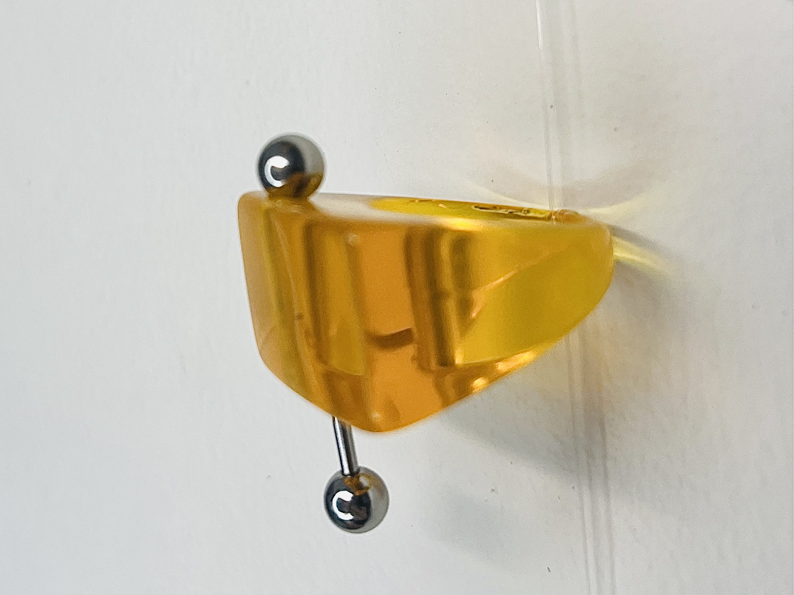 Bague en acrylique transparente orange, pimpée avec un piercing en acier inoxydable, qui bouge avec le mouvement de la main. Résiste à l’eau.