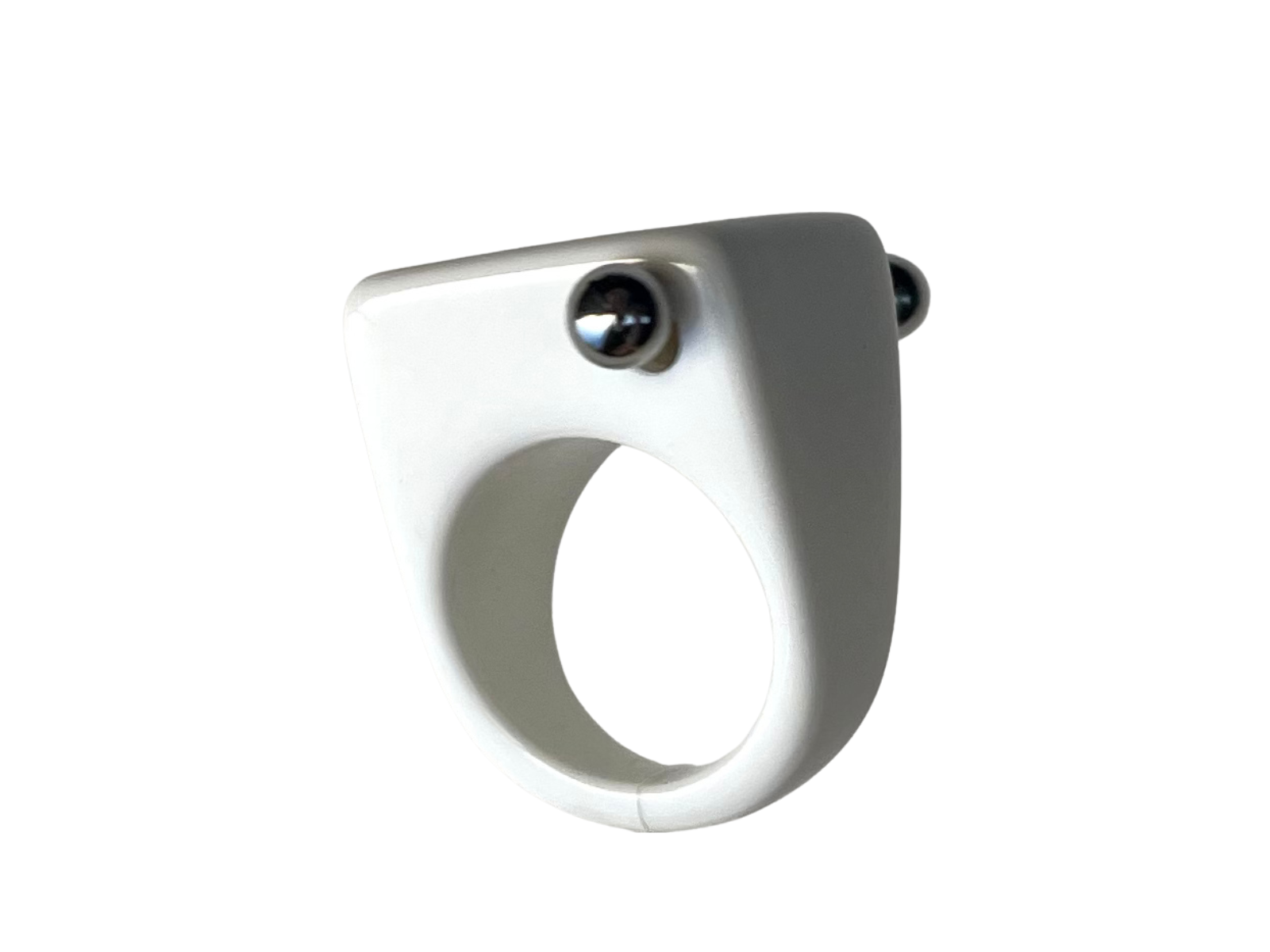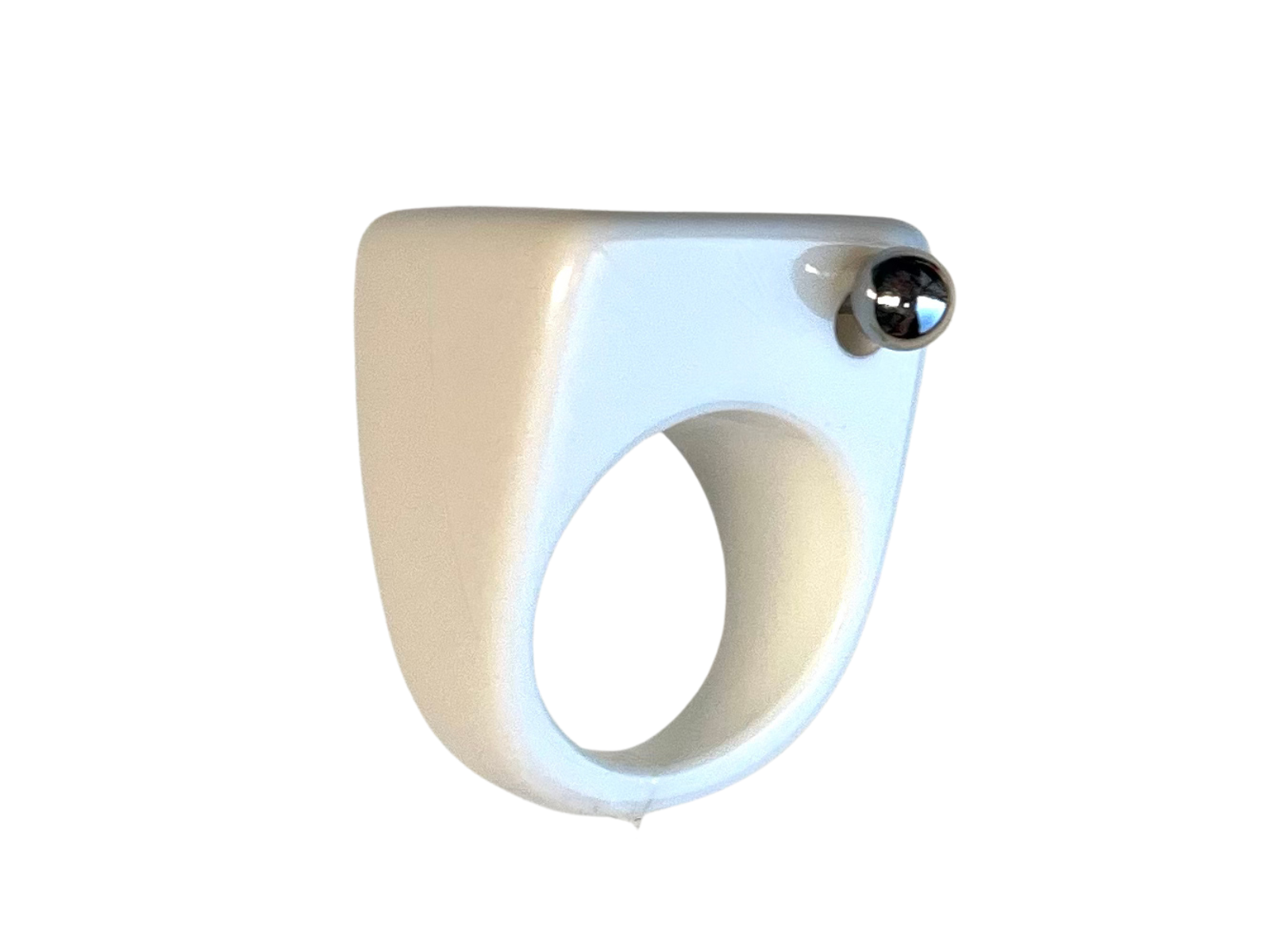 Bague en résine blanche, transpercé par un piercing en acier inoxydable de type téton. La taille du piercing lui permet de bouger et fait un bruit légé à chaque mouvement de main, ce qui est plutôt satisfaisant. La bague est résistante à l’eau et constitué de matériaux solides, ce qui fait d’elle un produit ultra résistant que vous garderez des années ( si vous l’oubliez pas chez votre ex ). Pièce 100% upcyclé, créée dans notre atelier au Pays Basque.