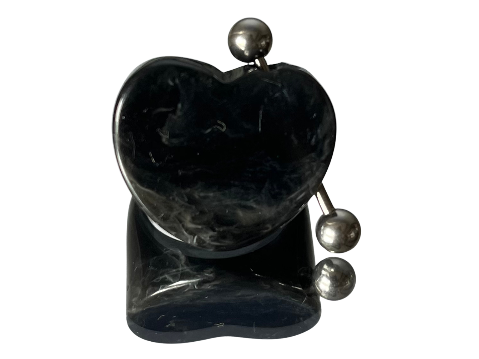 Bague en résine noir effet marbre en forme de coeur, perçé par un piercing style téton en acier inoxydable; pièce unique, faite main et résistante à l’eau. Le piercing suit le mouvement de la main et fait du bruit quand ça bouge ( et on adore <33 )