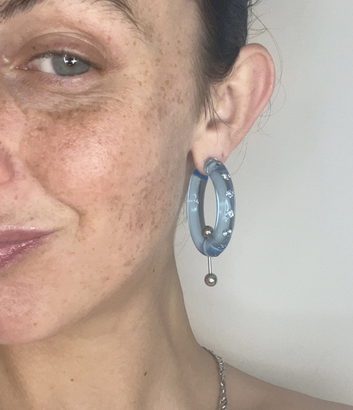 Boucles d’oreilles acrylique bleu transparent et strass, pimpé avec un piercing en acier, pièce unique résitante à l’eau.