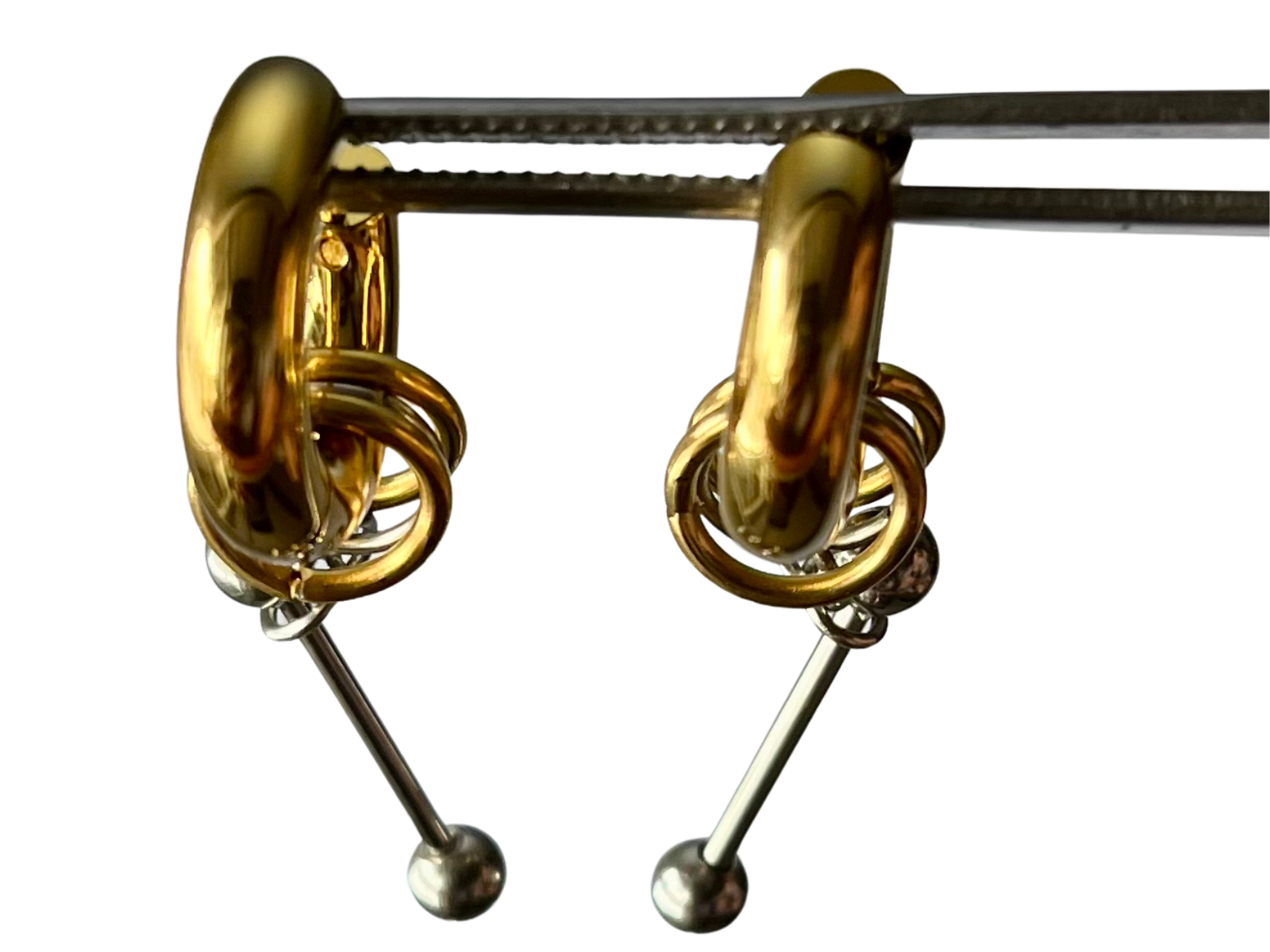 Boucles d’oreilles en acier inoxydable, mix de couleurs d’anneaux et piercing long. Pièce unique et résistante à l’eau fait main dans notre atelier au pays basque.