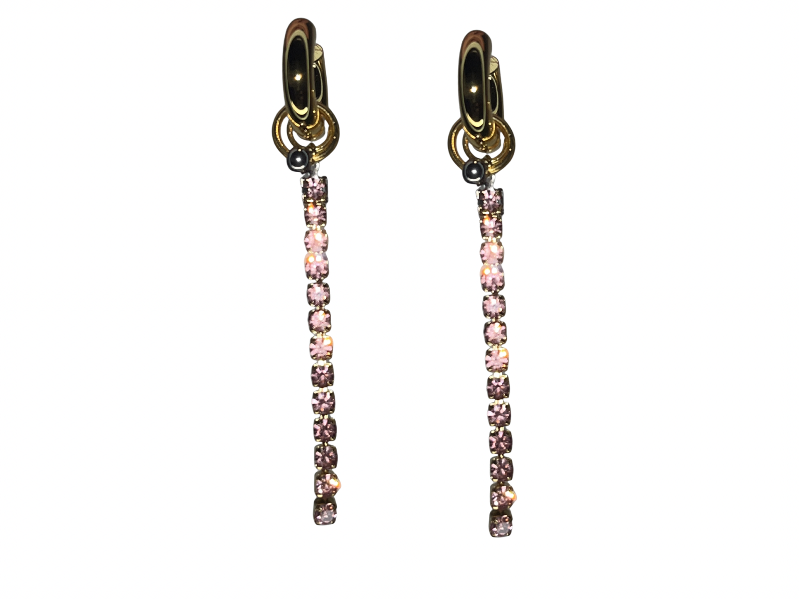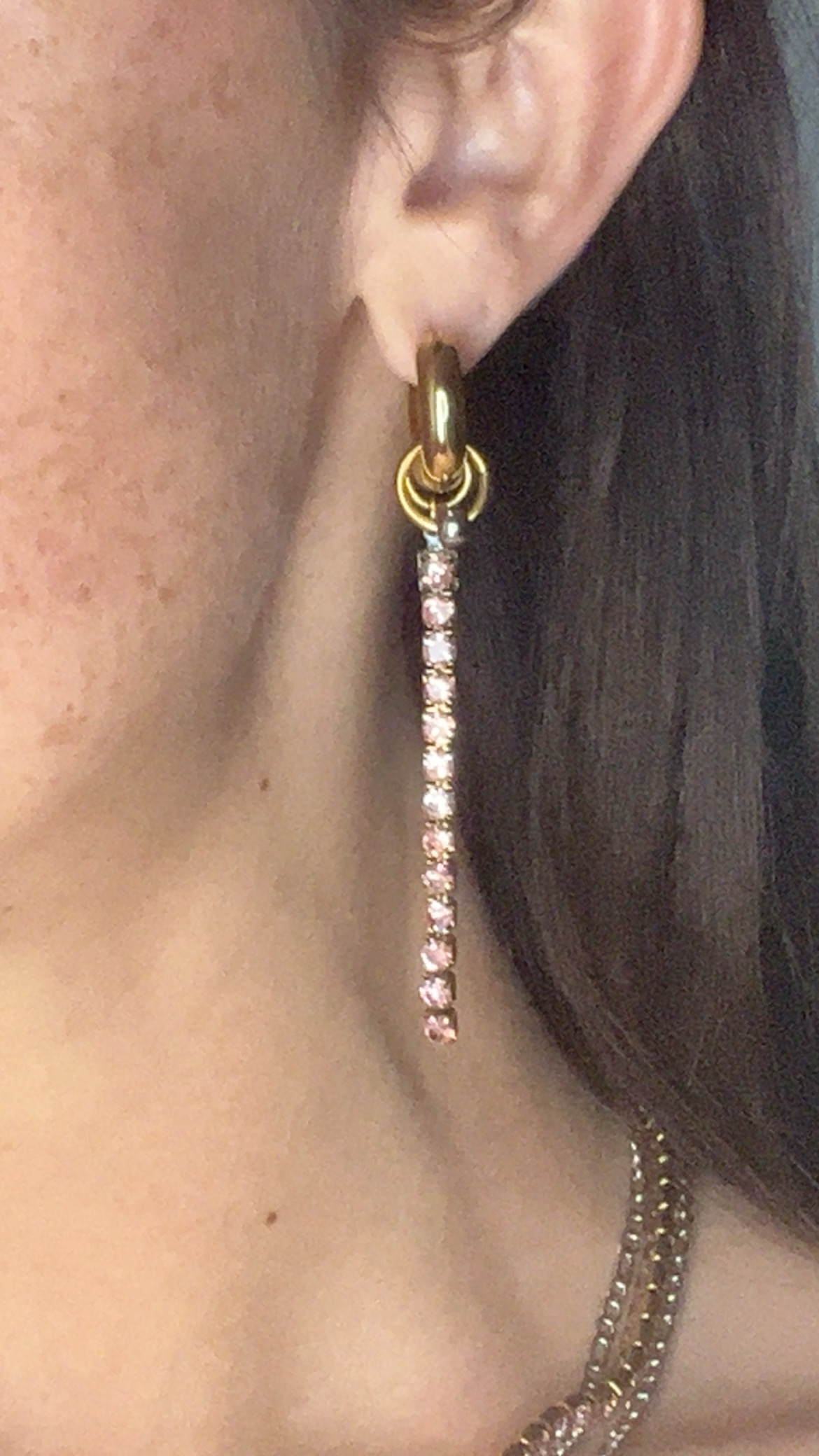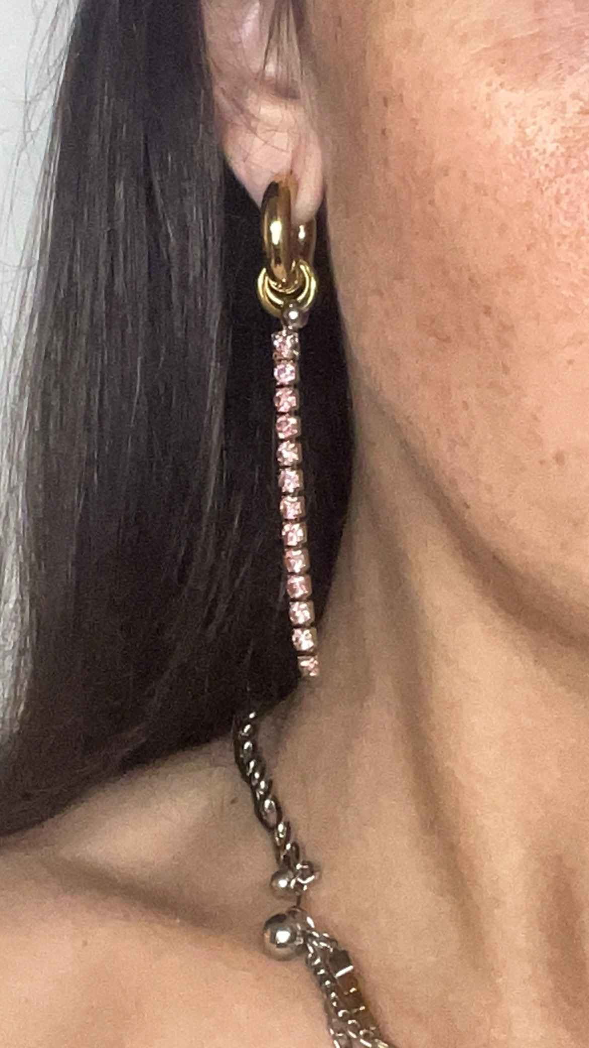 Boucles d’oreilles en acier inoxydable doré, monture épaisse, chaine en strass rose et pendentif style piercing septum. Bijoux résistant à l’eau.