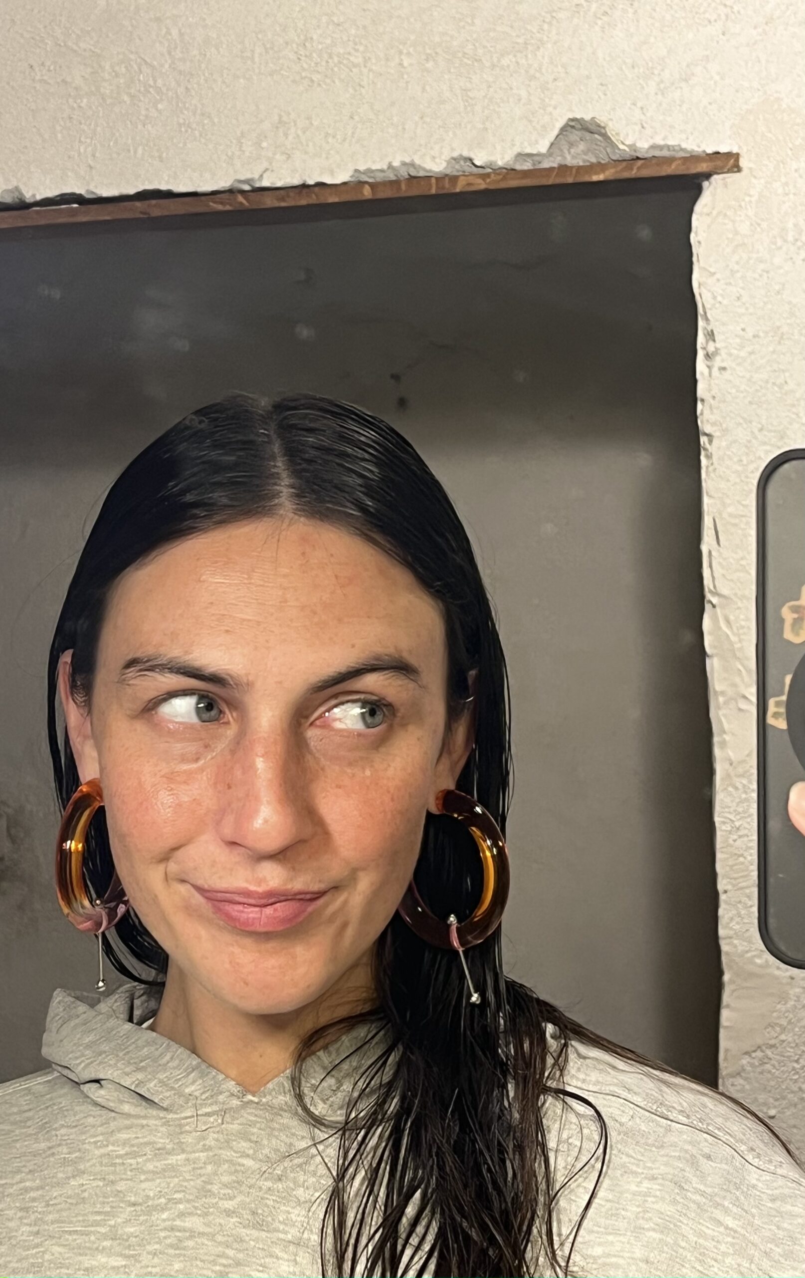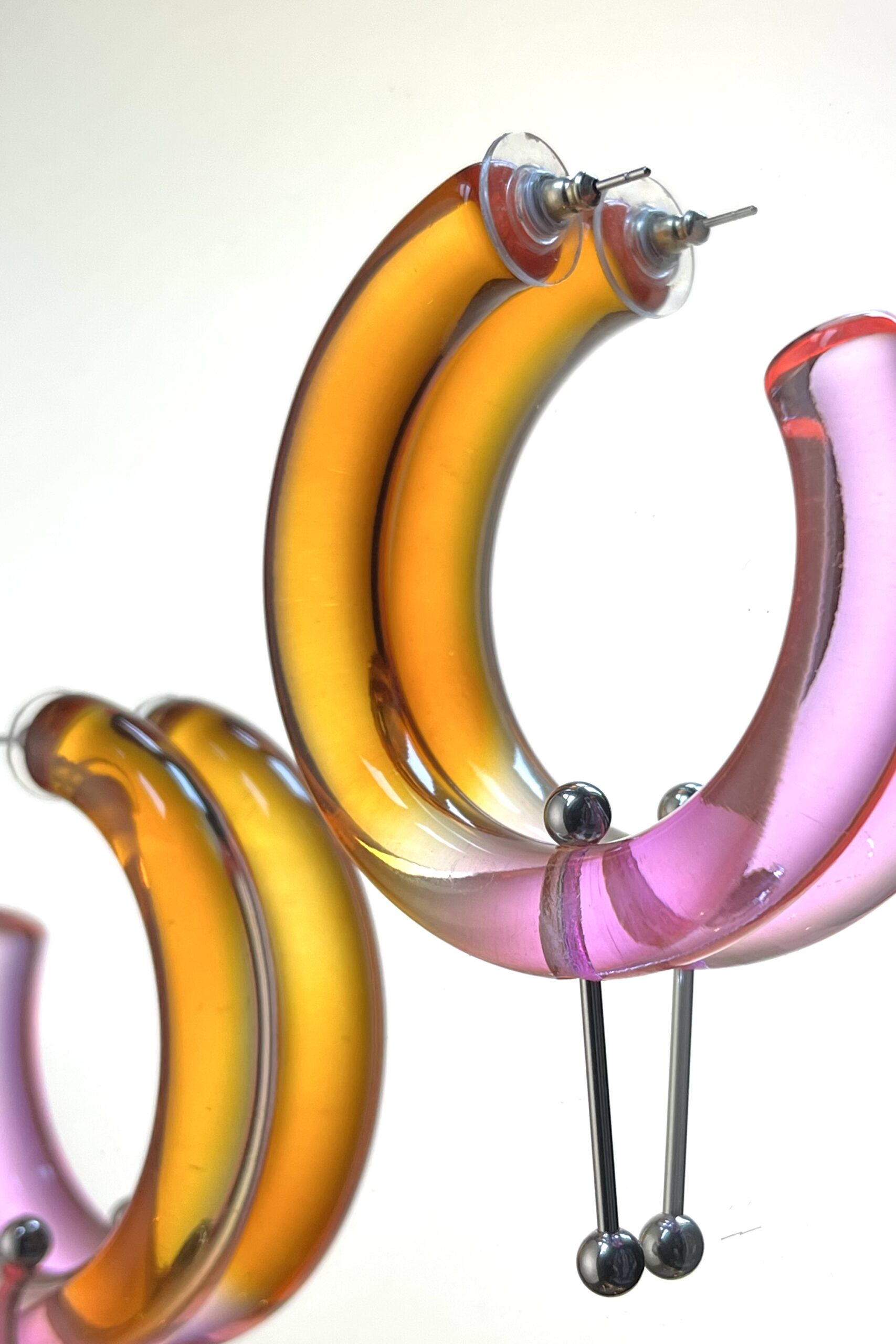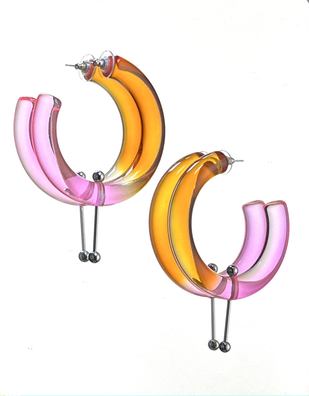 Boucles d’oreilles en acrylique transparent, sublimées par un dégradé délicat de rose et d’orange. Elles sont traversées par un piercing barre en acier, qui se glisse dans l’arrondi de la boucle et s’aligne harmonieusement avec le cou.