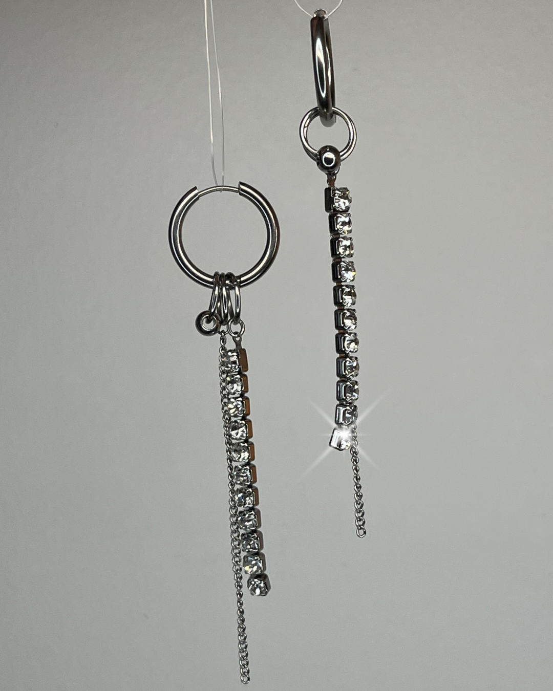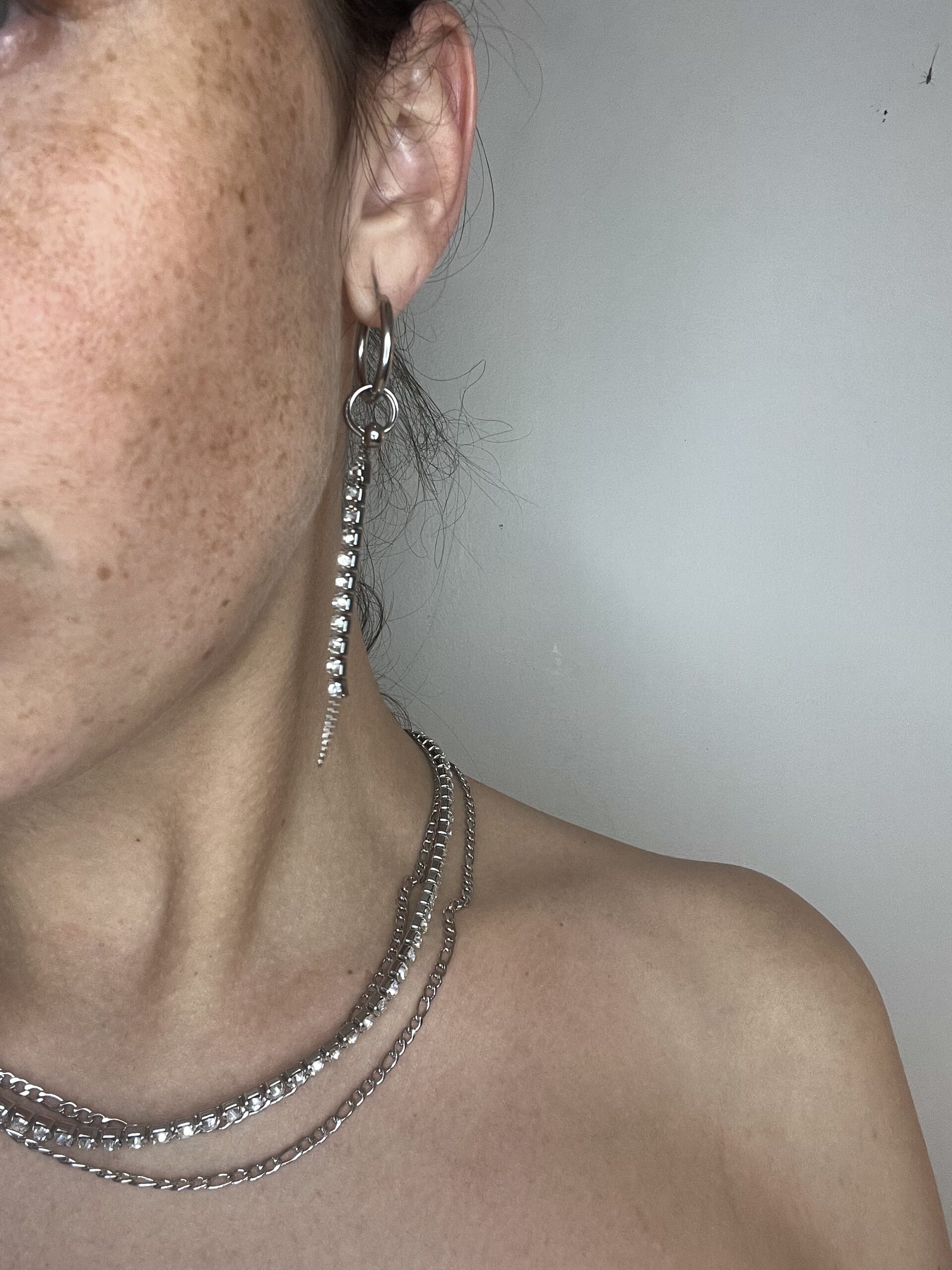 Boucles en acier inoxydable argenté, chainette, strass et pendentif style piercing septum. Boucles hypoallergénique et résistante à l’eau.