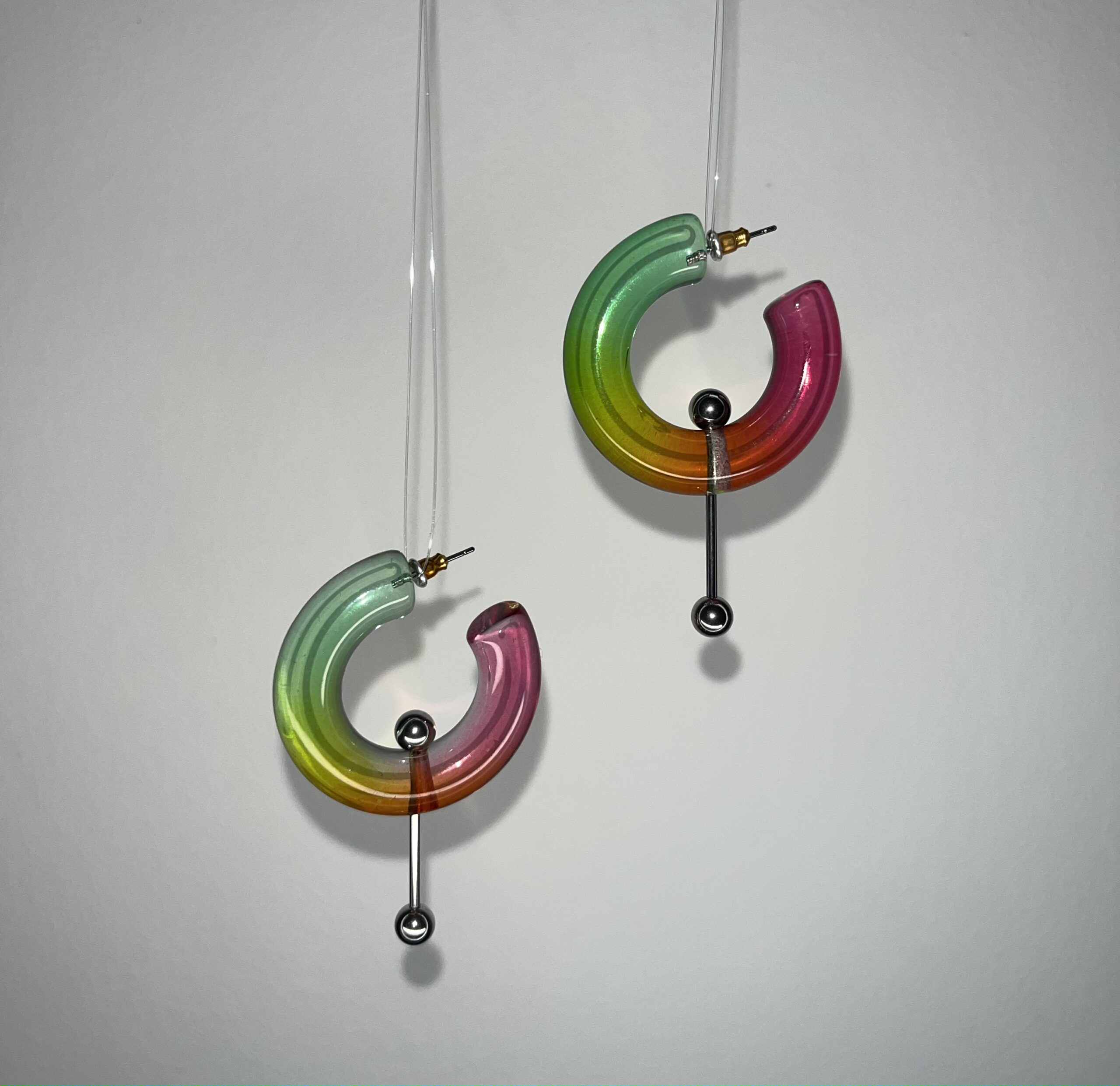 Boucles en acrylique dégradé de couleurs rose rouge jaune et vert sur transparence, transpercé d’un piercing en acier inoxydable, pièce unique, designé et assemblé dans notre atelier au pays basque.