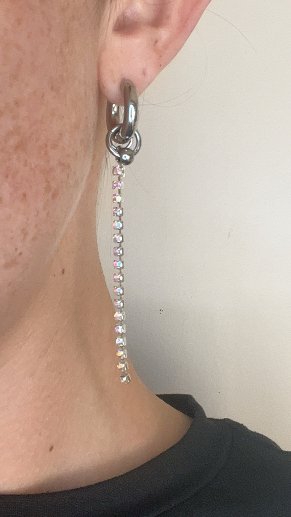 Boucles d’oreilles en acier inoxydable argenté, monture légèrement épaisse, chaine en strass et pendentif style piercing septum. Bijoux résistant à l’eau et hypoallergénique.