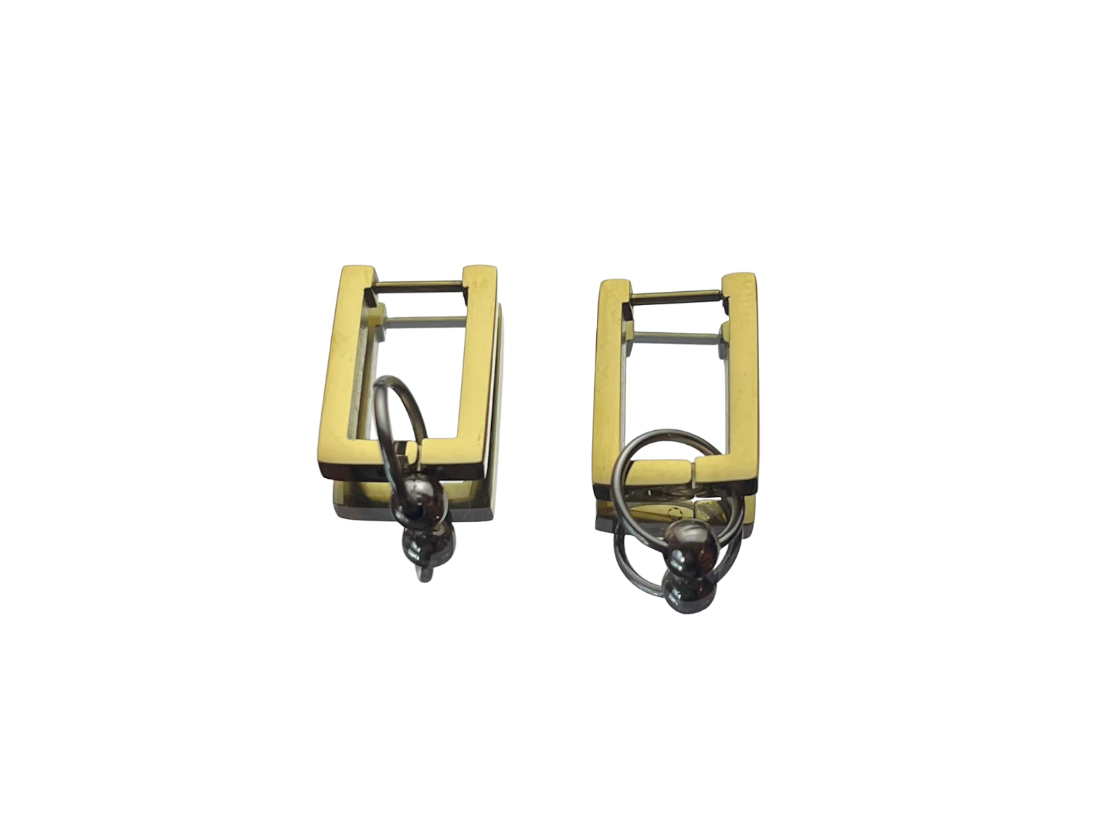 Boucles d’oreilles en acier inoxydable doré sur monture rectangulaire fine, et petit pendentif de type piercing septum upcyclé. Boucles désigné et assemblé dans notre atelier au pays basque, résistante à l’eau et hypoallergénique.