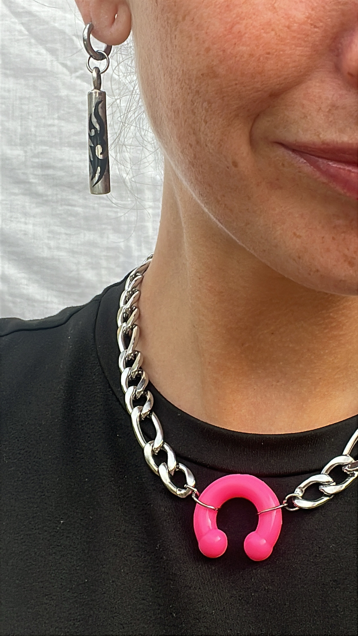 Boucles d’oreilles en monture acier inoxydable et hypoallergénqique, pendentif Rectangle arrondie au motif tribal en plaqué argent. Pièce unique et upcyclé.