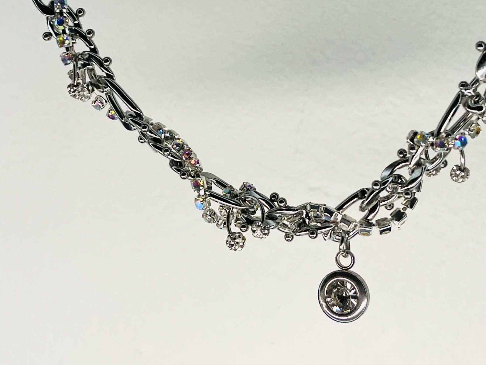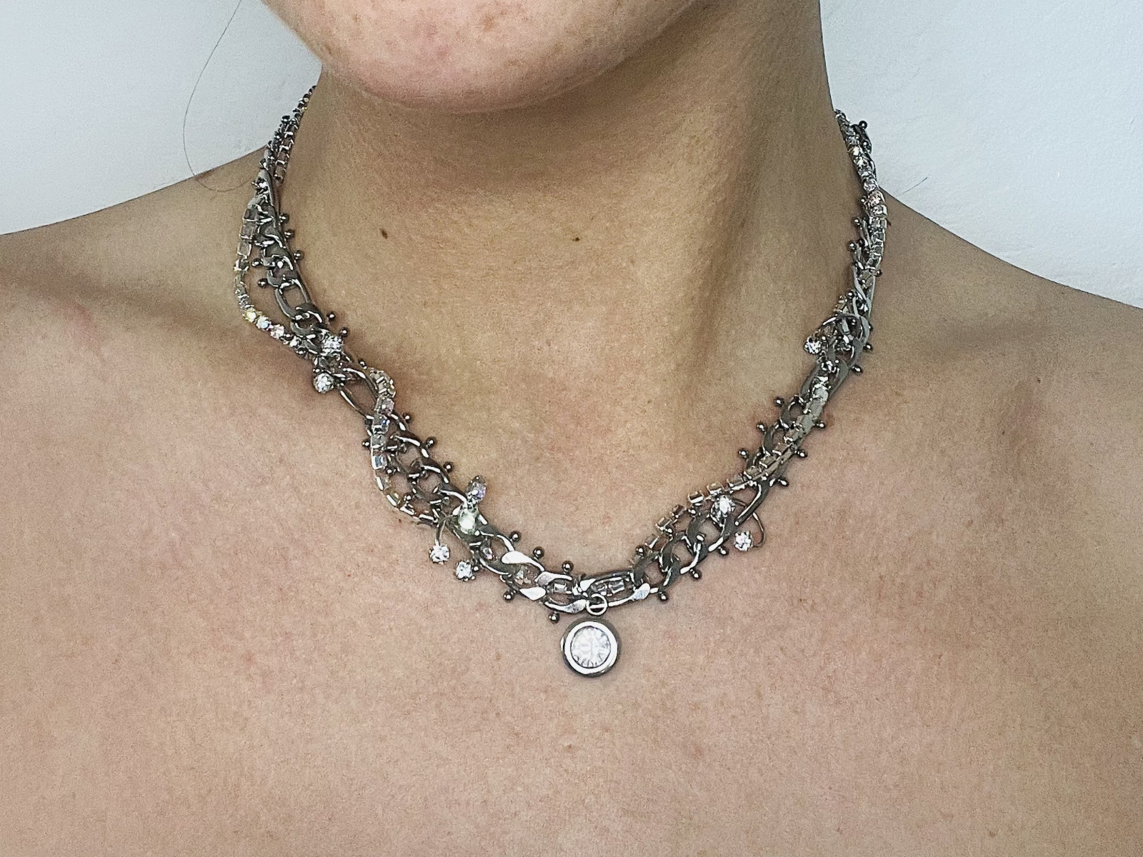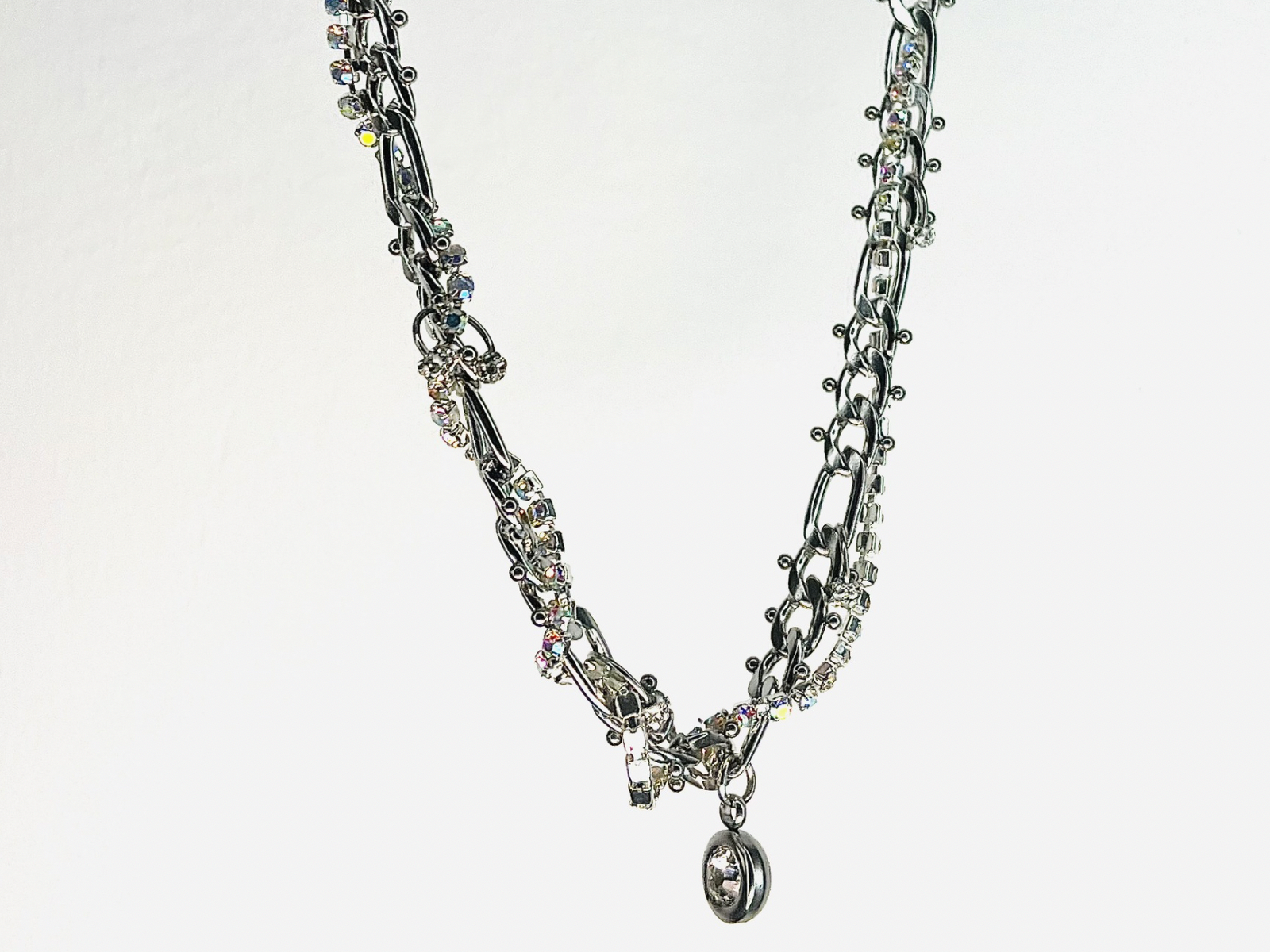 Collier en acier inoxydable argenté, maille type figaro avec détaille de petit rond en relief, entremêlé avec une petite chainette strass facetté qui réfléchis la lumière; petit pendentif en strass et détaille de 4 piercing style septum avec strass. Bijou résistant à l’eau et hypoallergénique.