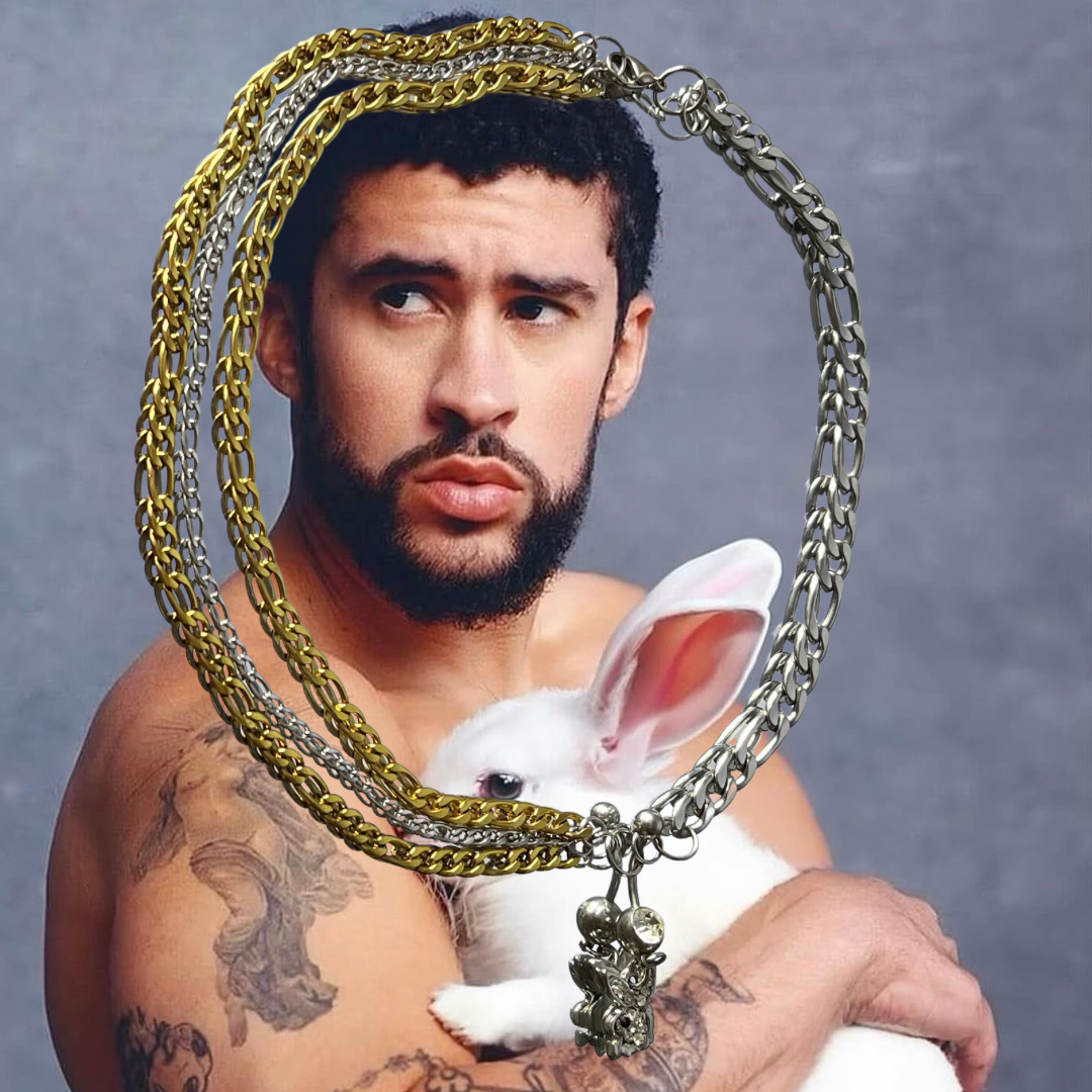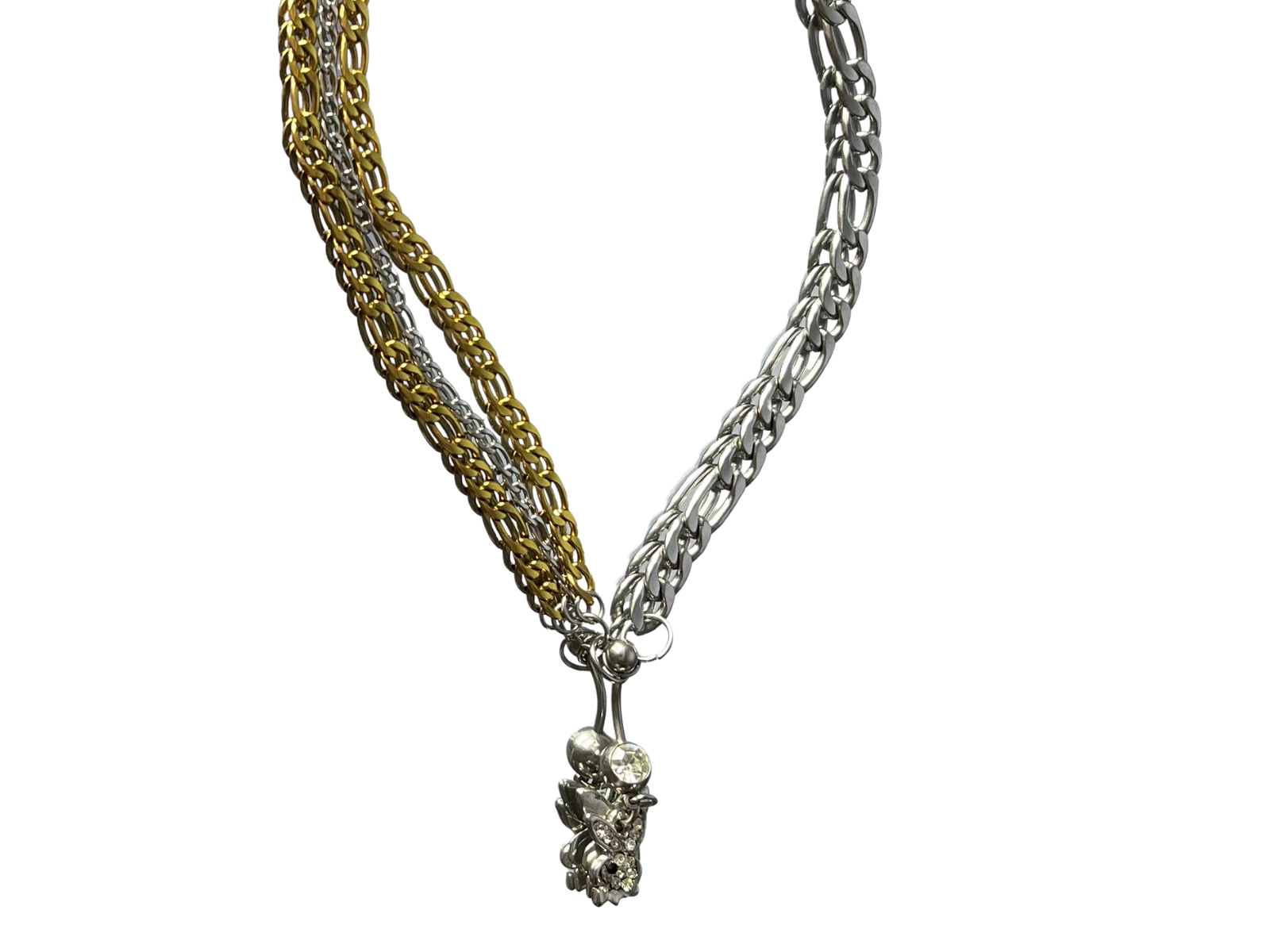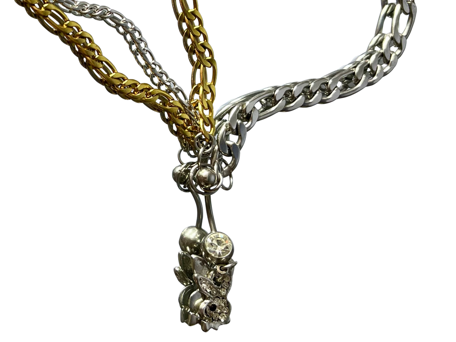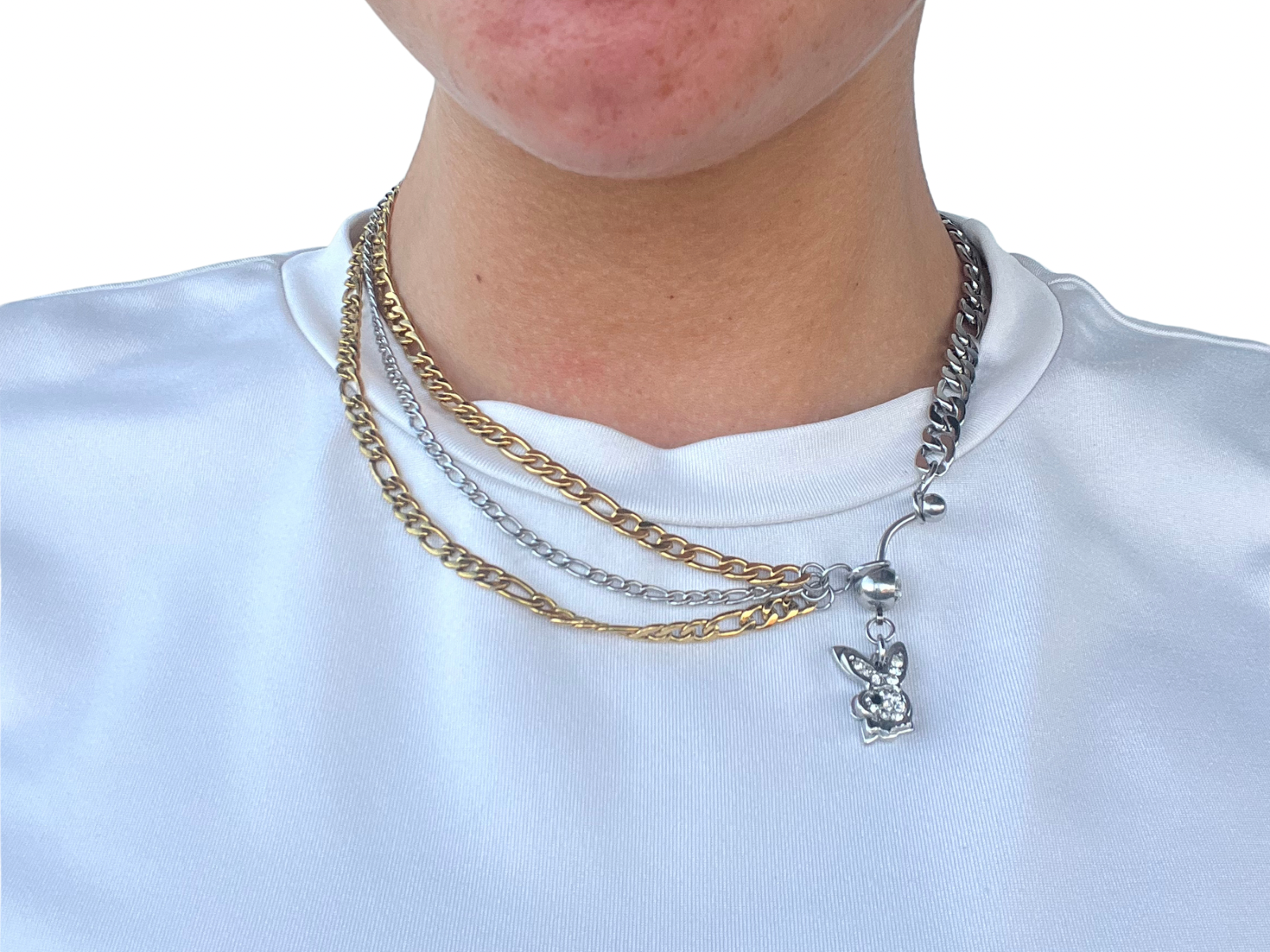 Collier en acier inoxydable, mix de chaînes argenté et doré, orné d’un piercing pendentif Playboy à strass. Ce collier est une pièce unique, résistante à l’eau, et hyppoallergénic.