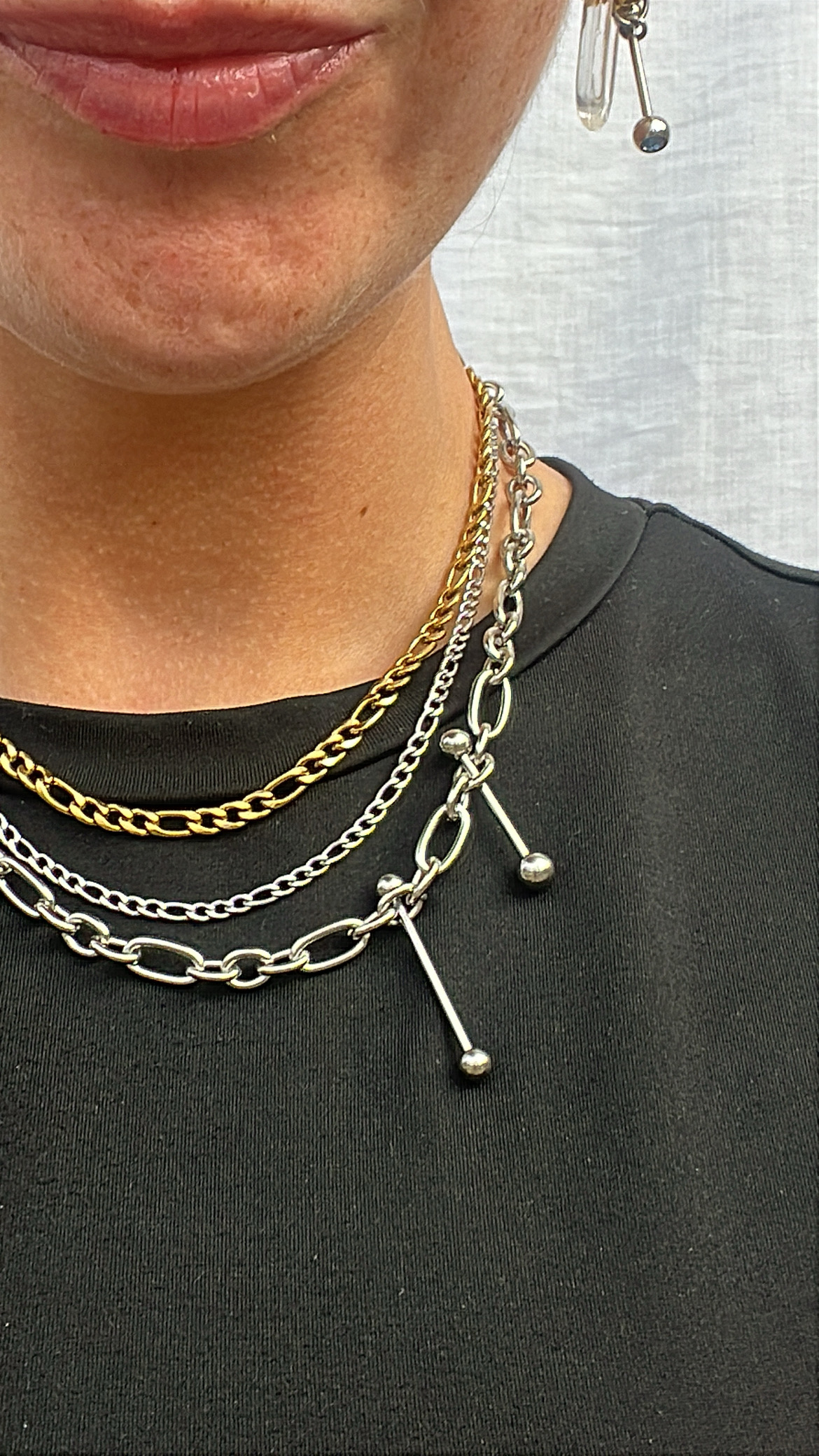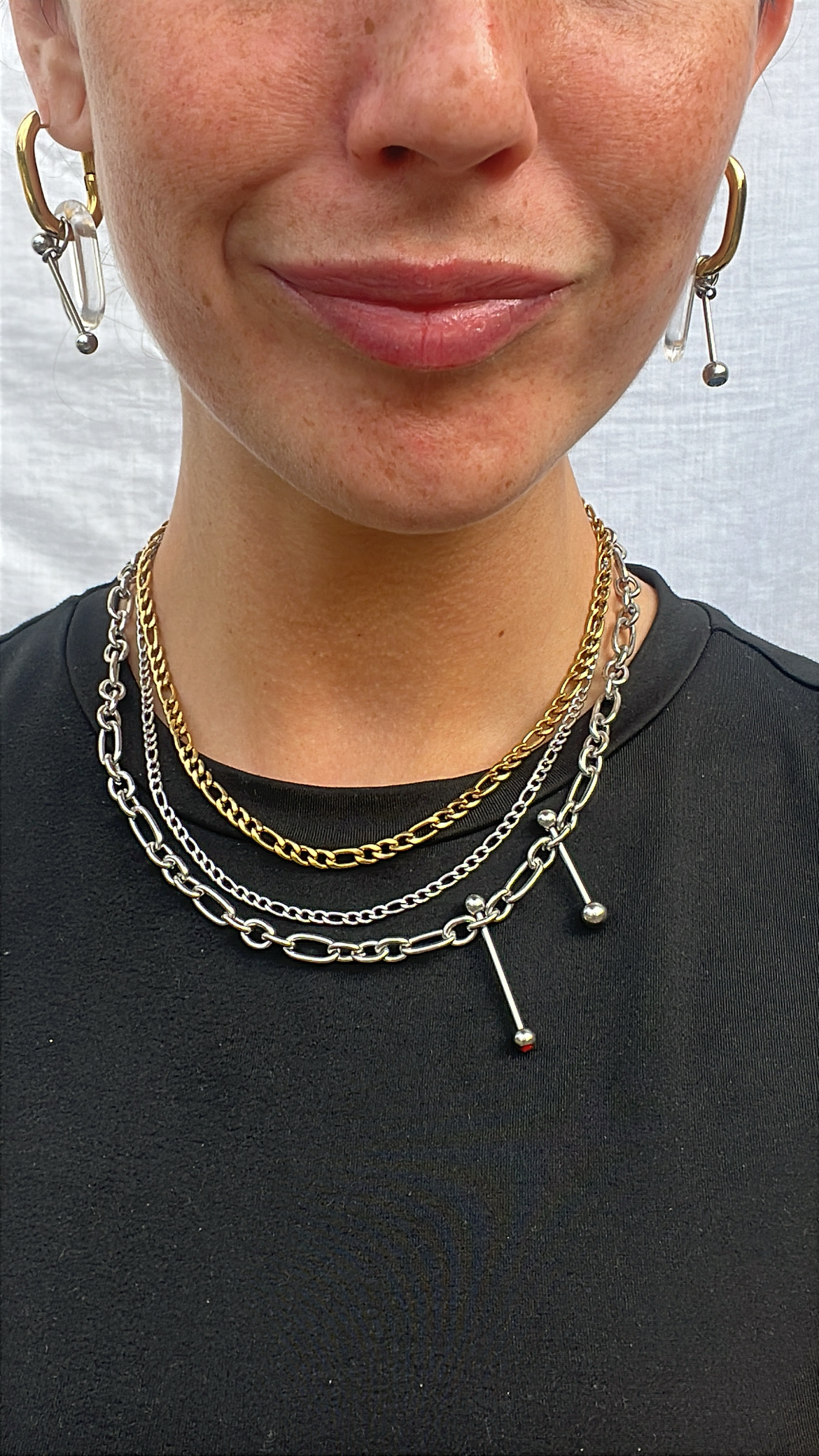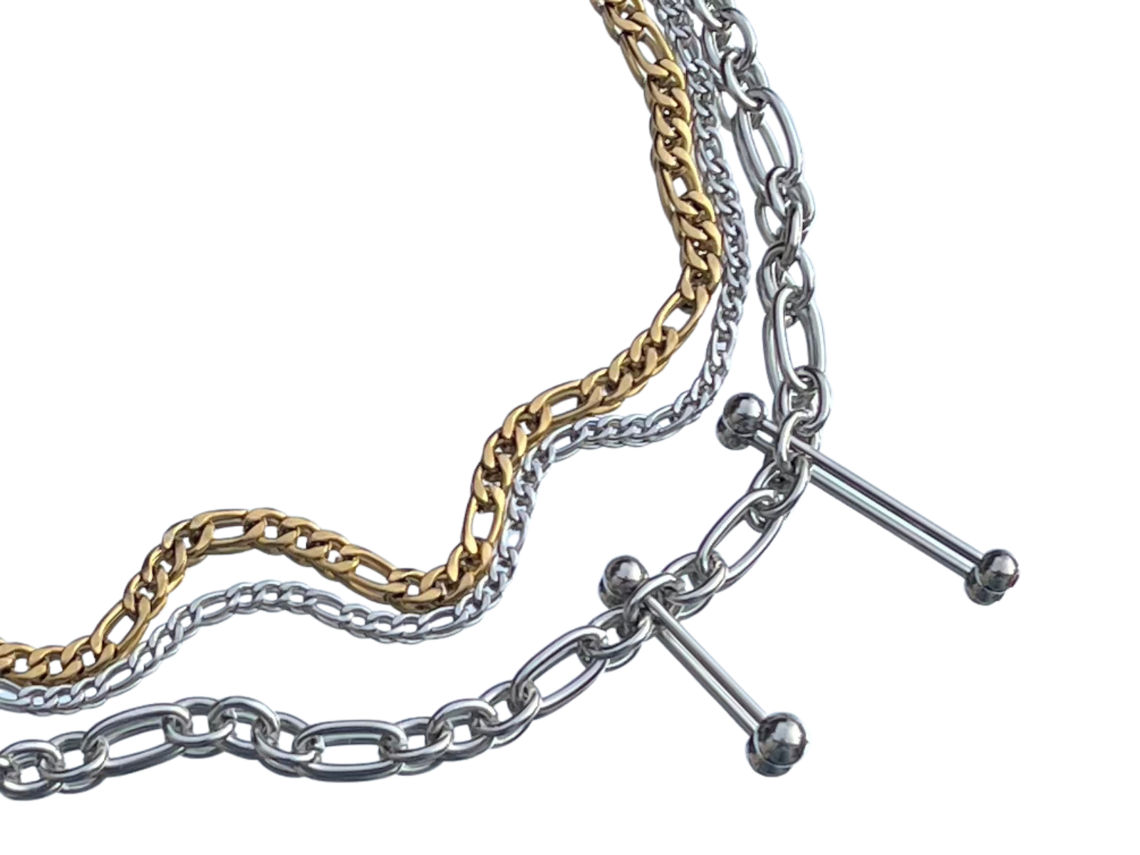 Collier en acier inoxydable, mix de trois types de chaines différentes, doré et argenté, orné de deux piercing en acier, de taille différentes; Pièce unique et résistante à l’eau.