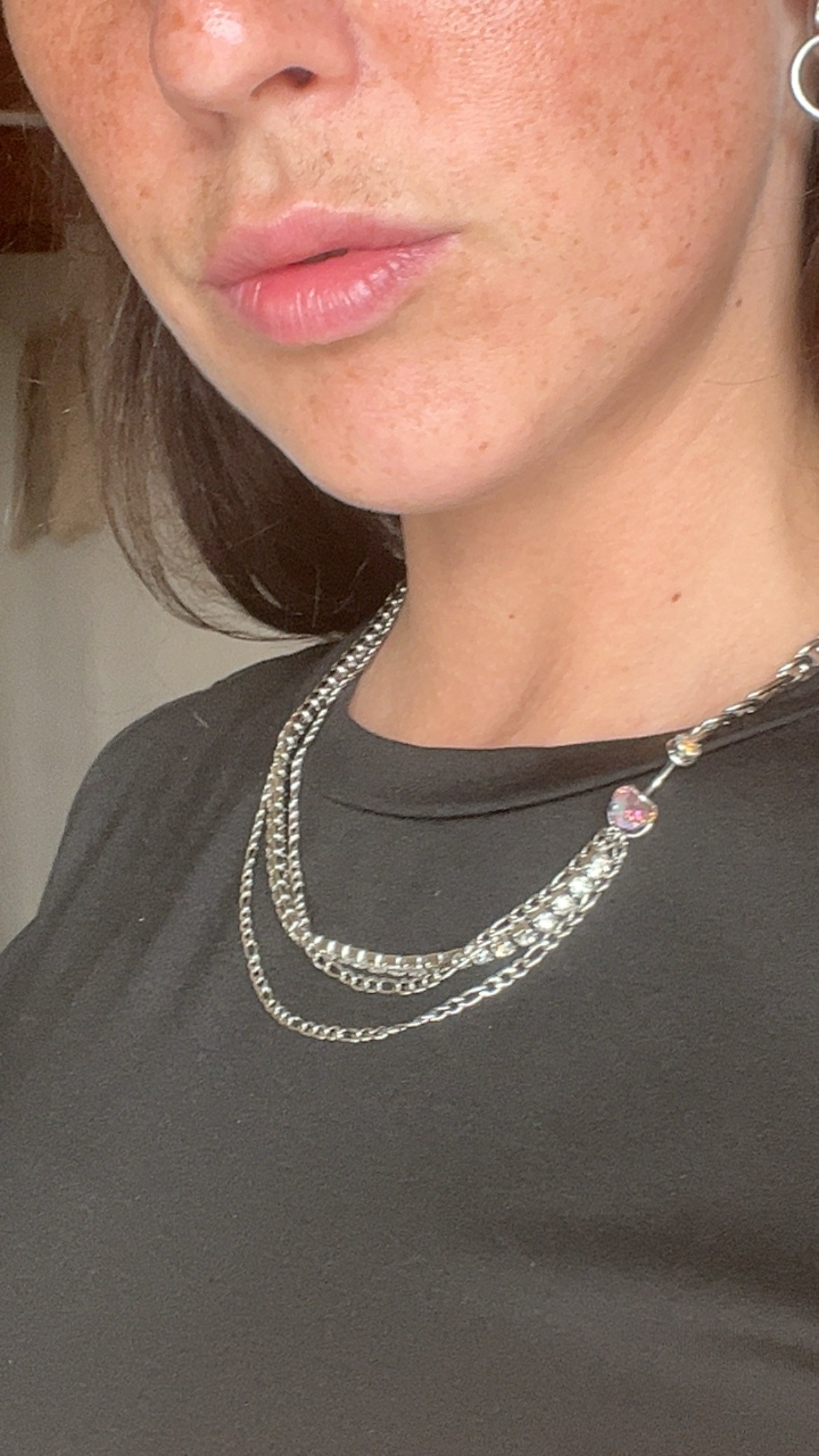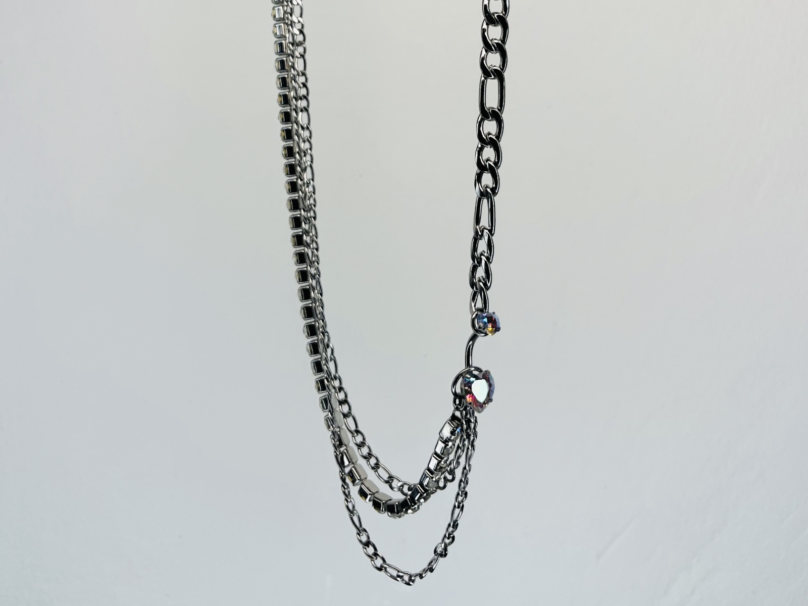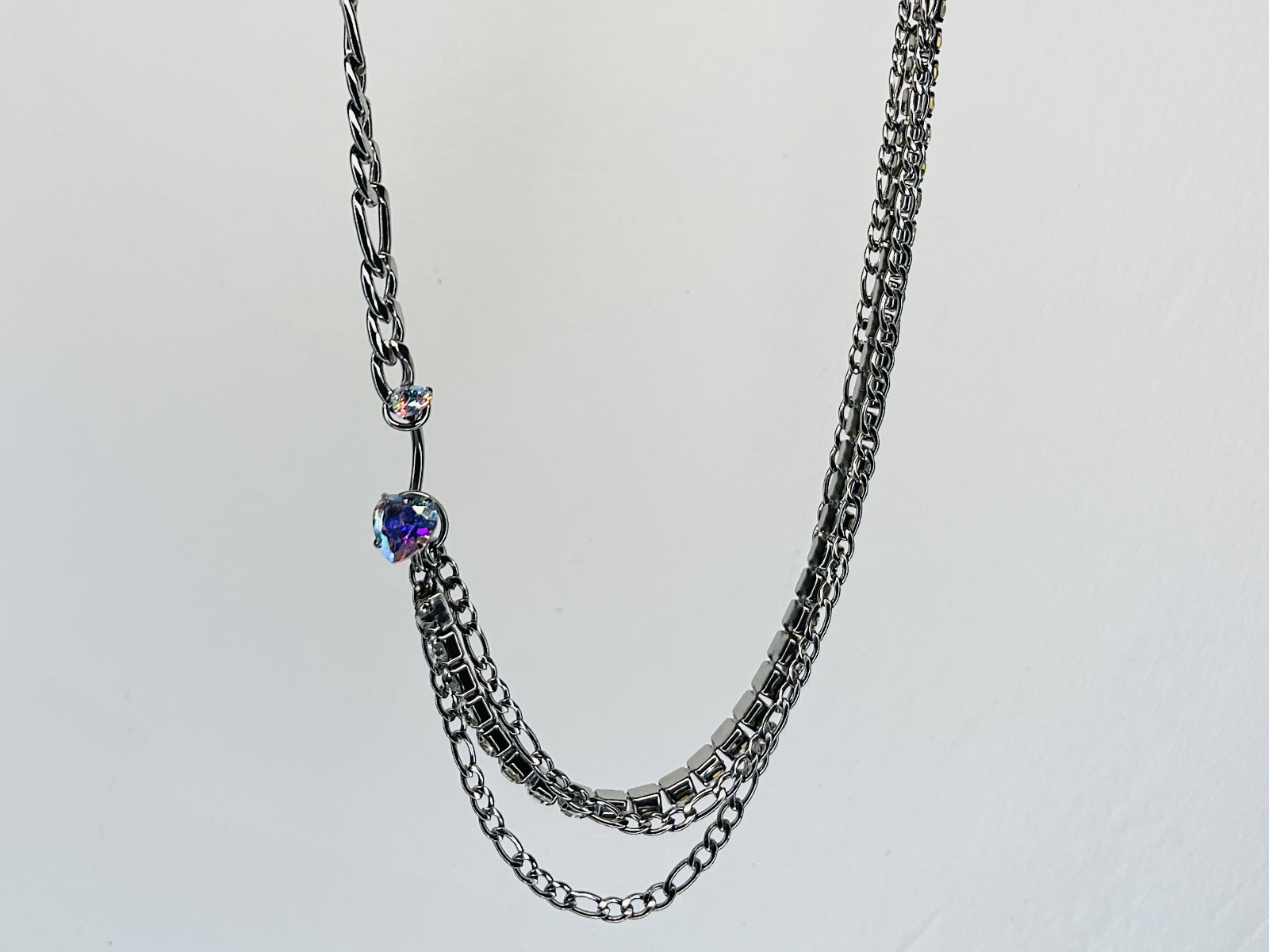 Collier en acier inoxydable asymétrique, chaine figaro et trio de chaine dont une strass, lié par un piercing en acier en forme de coeur facetté qui briiiiiille, résistant à l’eau et hypoallergénique. Possibilité de rallonger la chaine sur demande <333