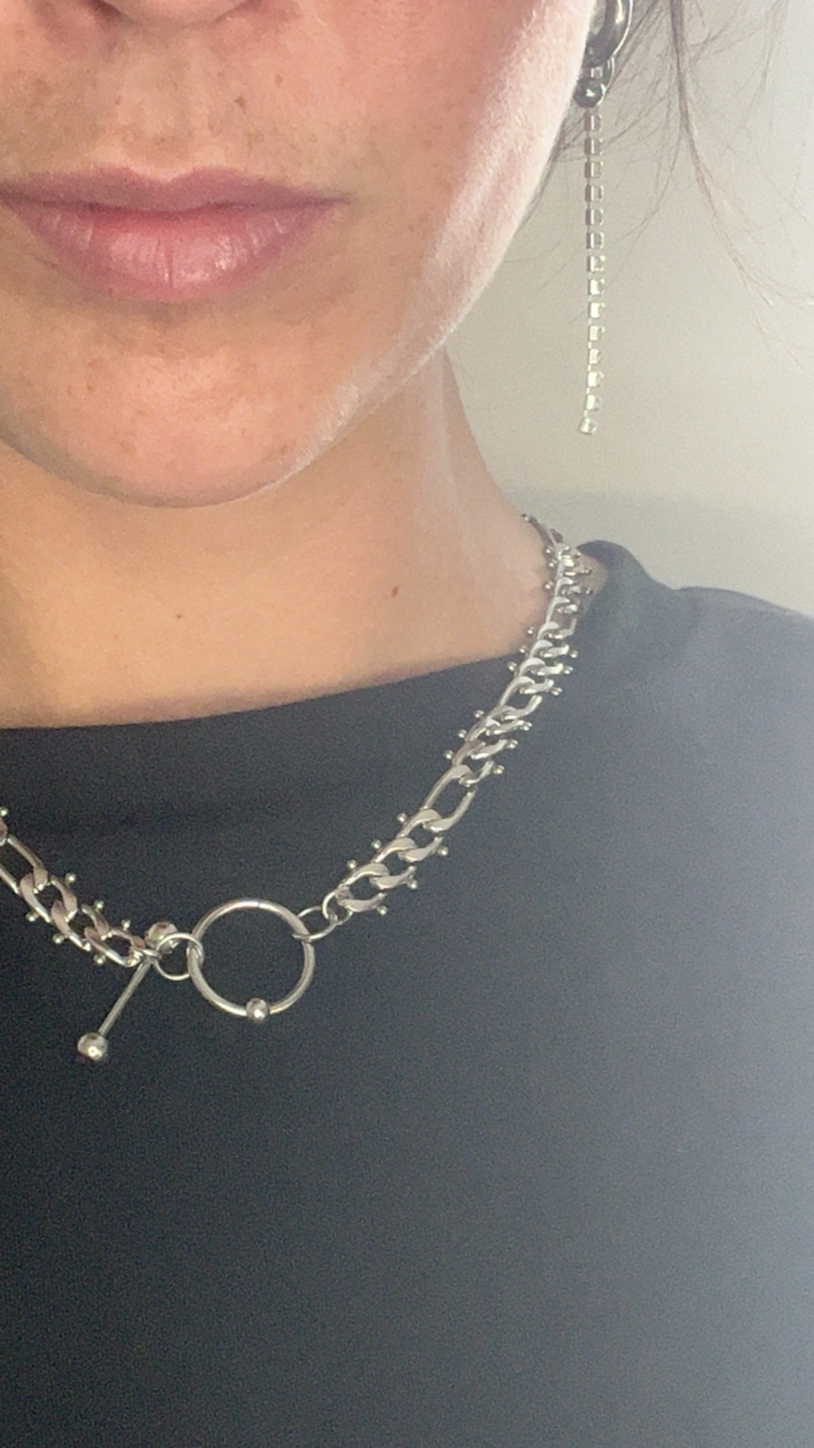 Collier en acier inoxydable argenté, maille de type figaro et détaille de petites boules rondes aux extrémités. Pendentif de type piercing septum, et piercing long asymétrique. Collier résistant à l’eau et hypoallergénique.