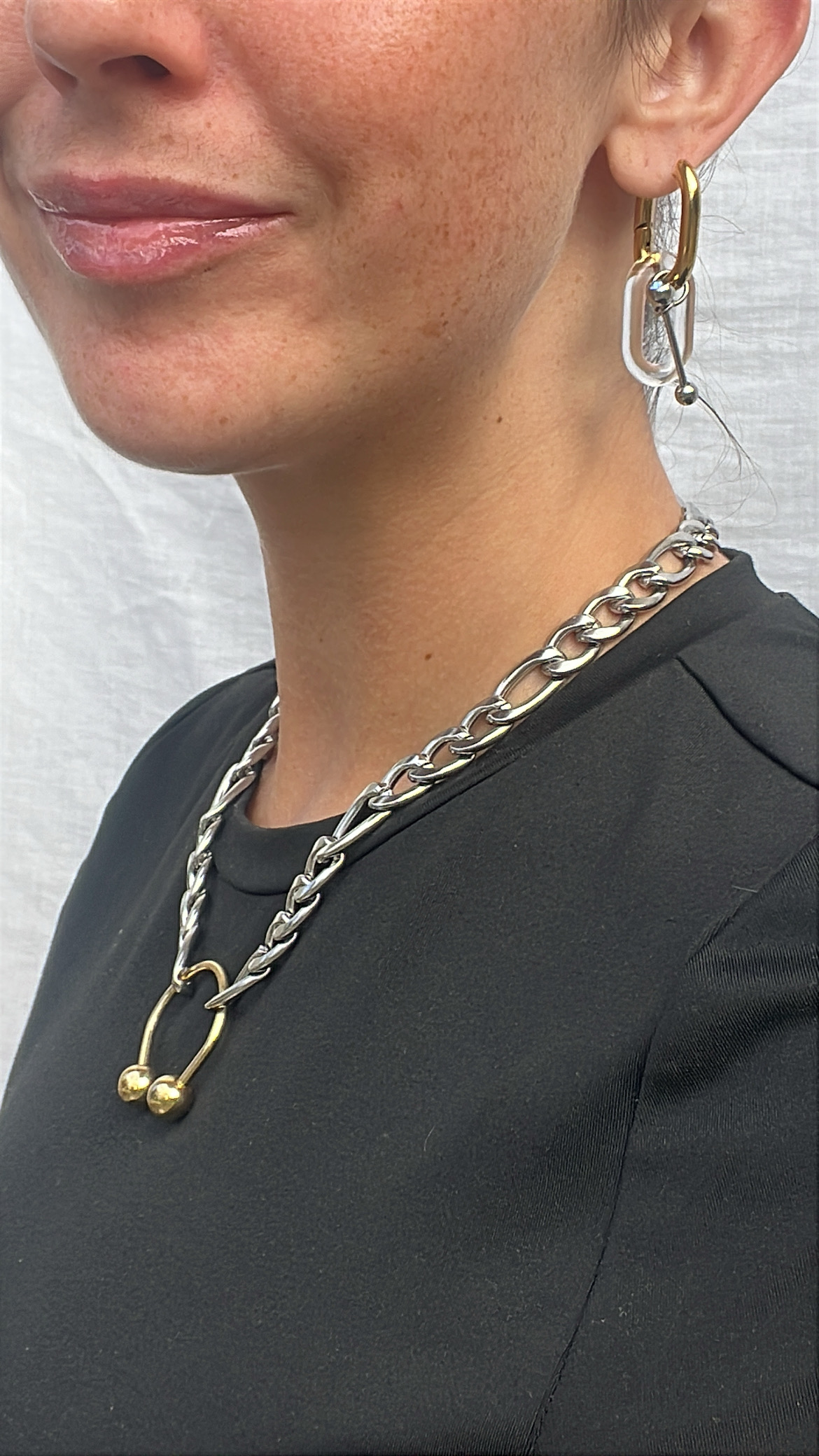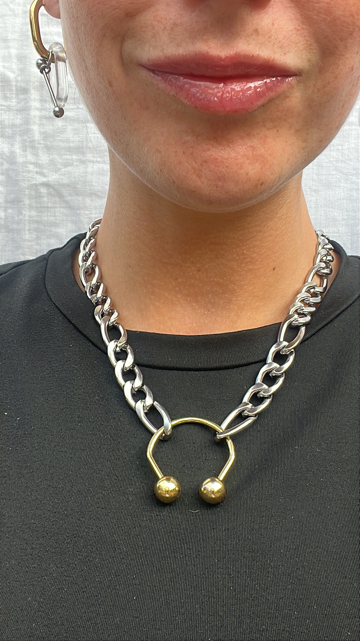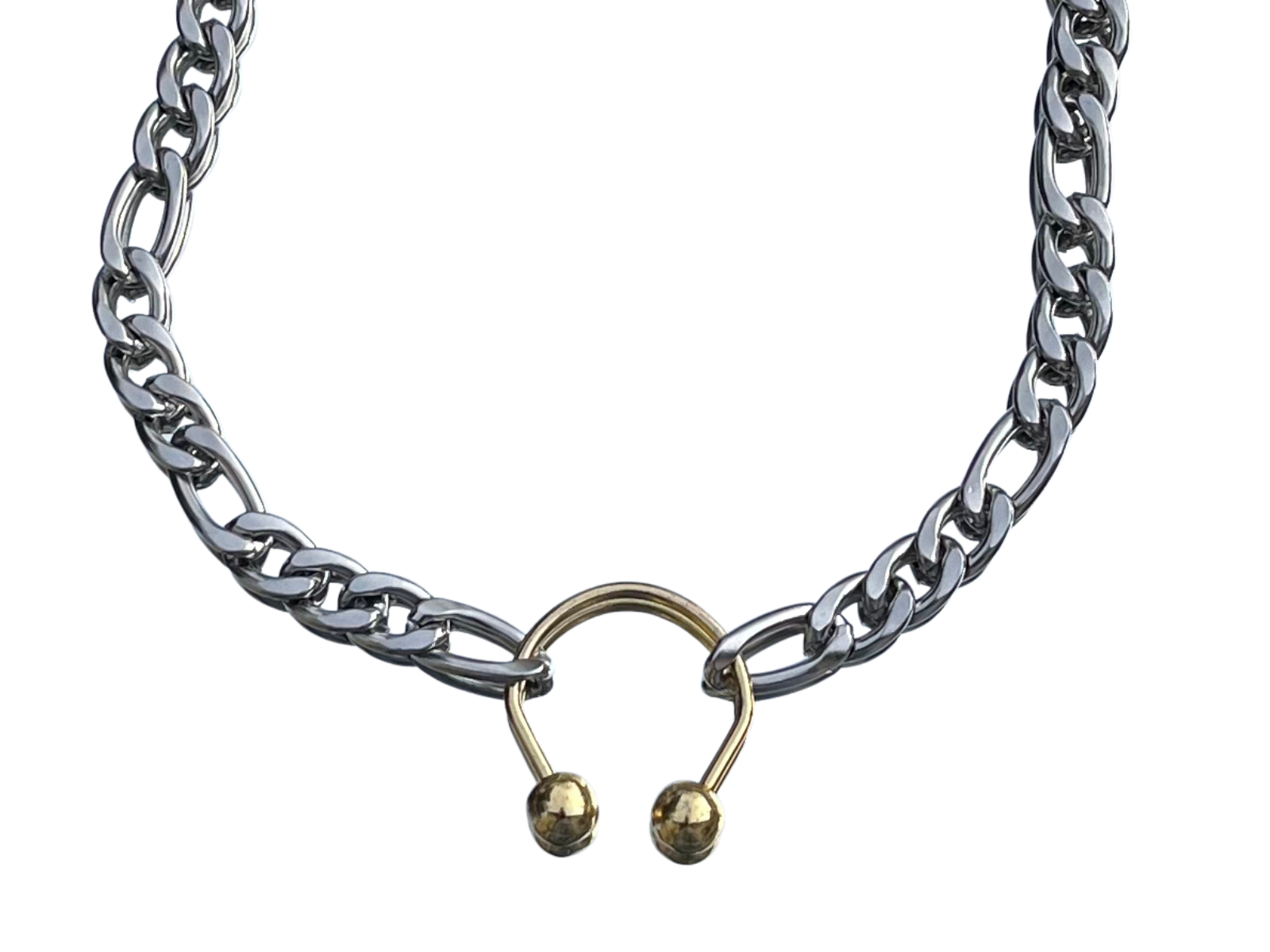 Collier en acier inoxydable argenté avec maille type figaro, joint par un « fer à cheval » doré, légèrement usé de par l’upcycling de la pièce. Pièce unique. La chaine est en acier inoxydable et donc ne changera pas de couleur au contact de la peau.