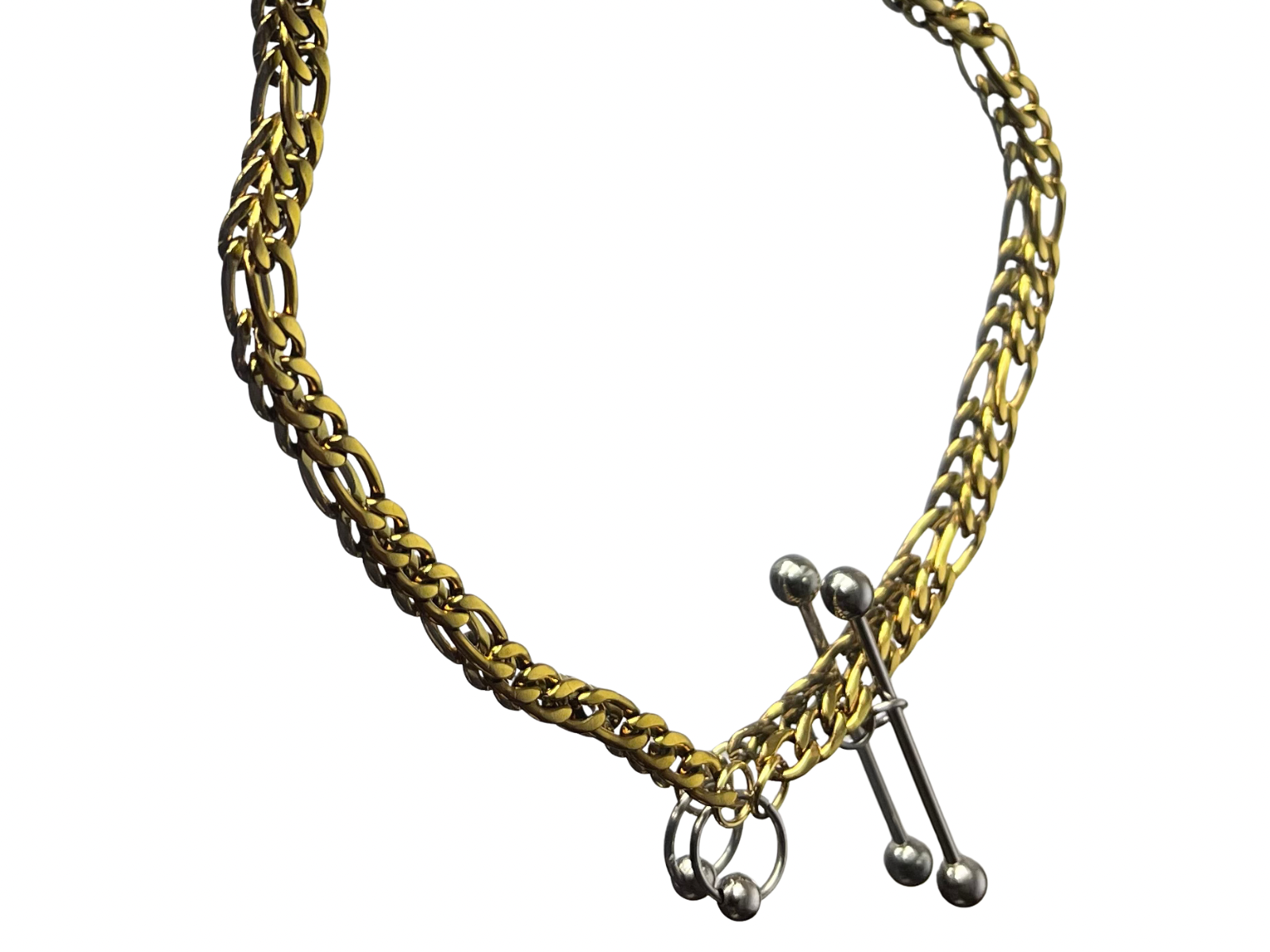 Collier en acier inoxydable doré sur maille figaro, lié par un piercing de type septum, orné d’un autre piercing en acier inoxydable, le collier se porte en asymétrie sur l’arrondie du cou. Pièce résistante à l’eau.