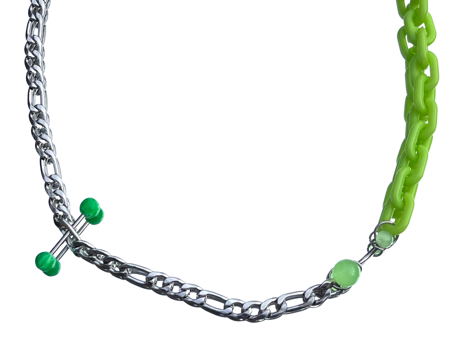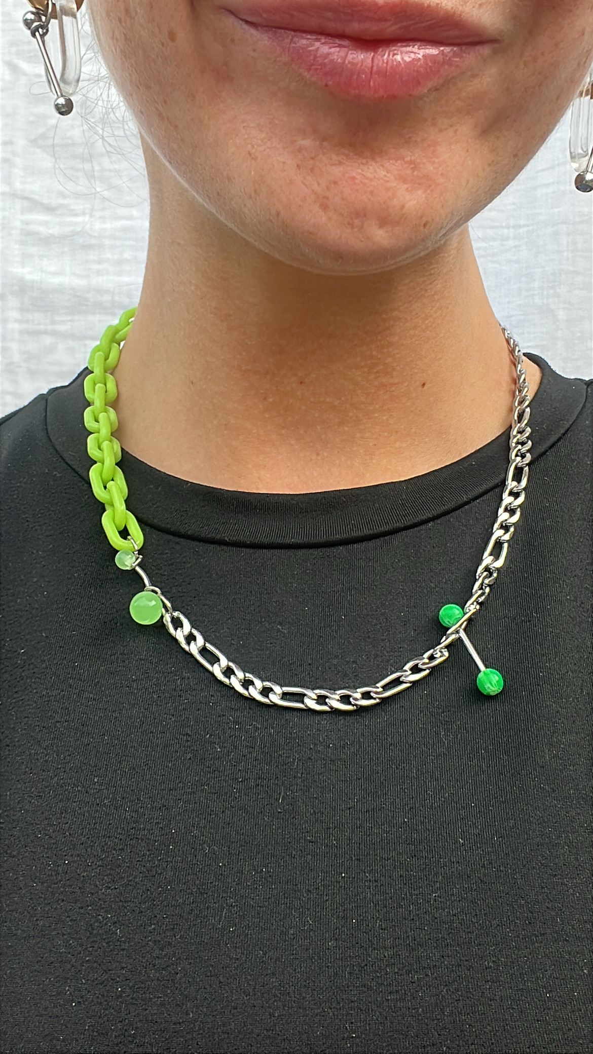 Collier en acier inoxydable argenté avec chaine de type figaro, assemblé avec une chaine en maille plastique verte anis, et pimpé avec des piercings de différents verts. Pièce unique et upcyclé.