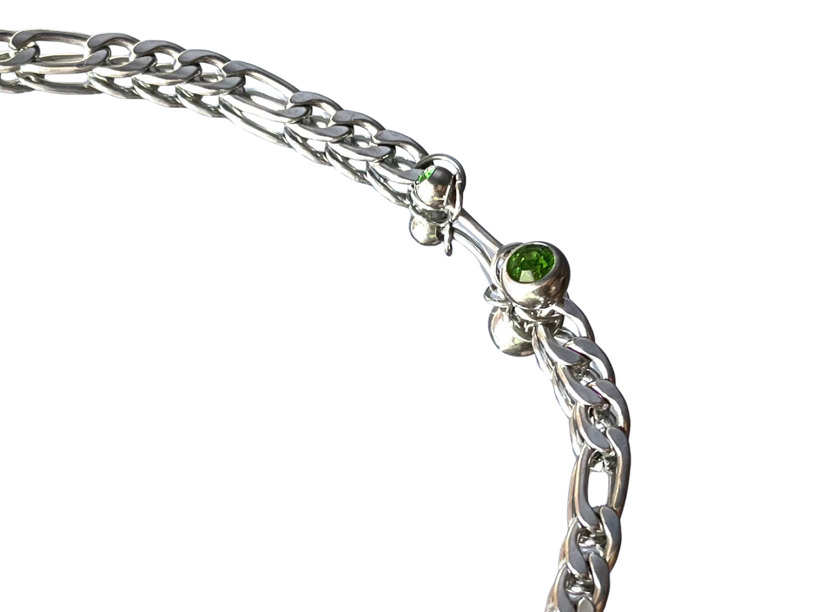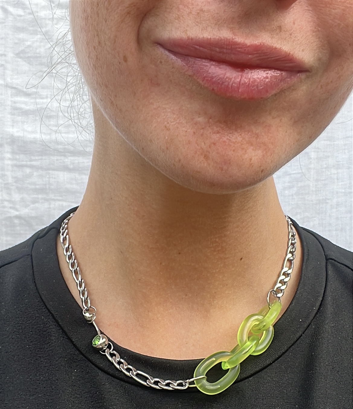 Collier en acier inoxydable argenté, joint par des mailles vertes en plastique et orné d’un piercing type nombril en acier et strass vert. Pièce unique résistante à l’eau.