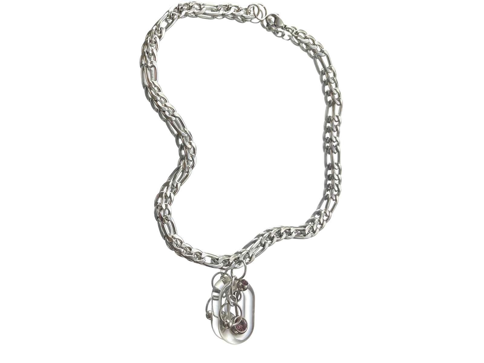Collier en acier inoxydable, chaine de type figaro, pendentif en maille plastique upcyclé, piercing nombril et piercing septum. Ce bijou est une pièce unique, résistante à l’eau, imaginé, désigné et assemblé dans notre atelier au pays basque.