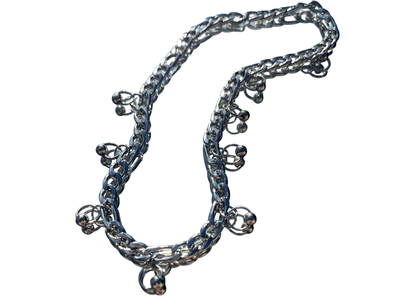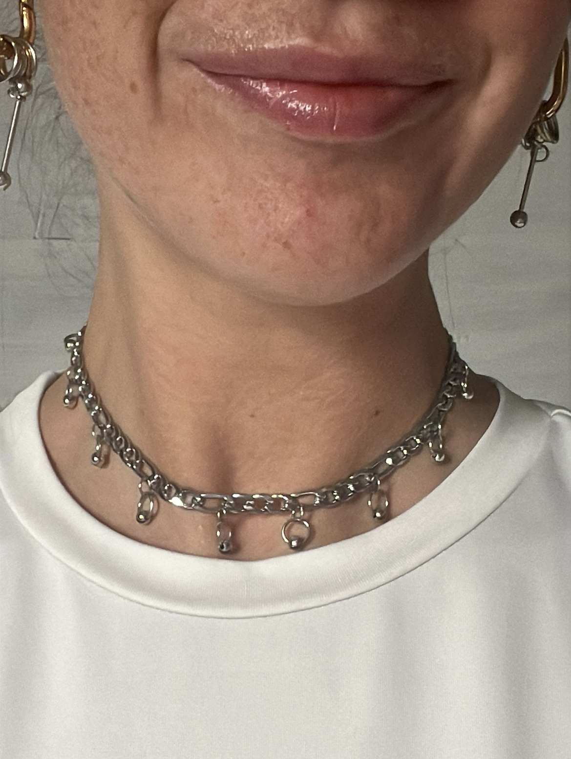 Collier en acier inoxydable de type figaro argenté, pimpé avec des pampilles de style piercing septum, composé d’un apprêt en acier et d’une bille plastique argenté upcyclé. Collier résistant à l’eau et hypoallergénique.