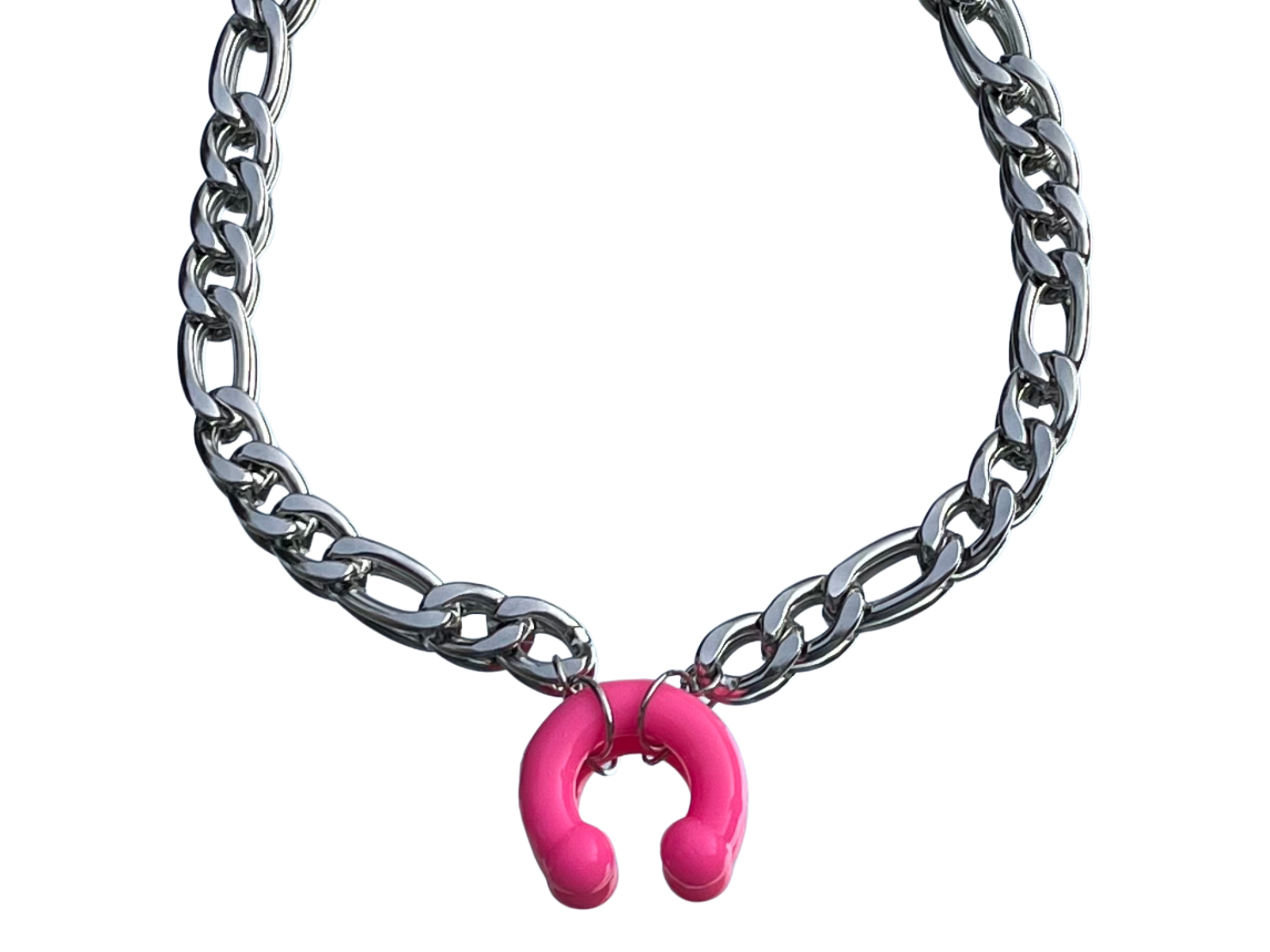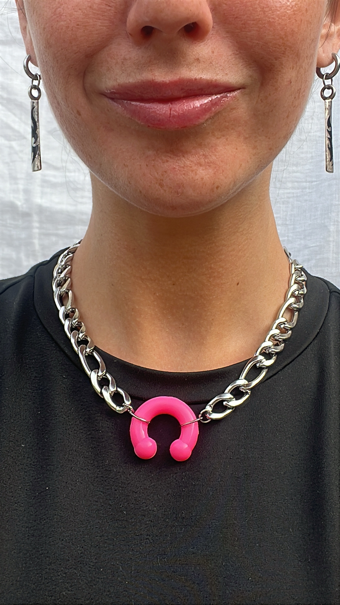 Collier en acier inoxydable argenté, assemblé par un piercing type fer à cheval en silicone rose fuchsia. Pièce unique et résistante à l’eau.