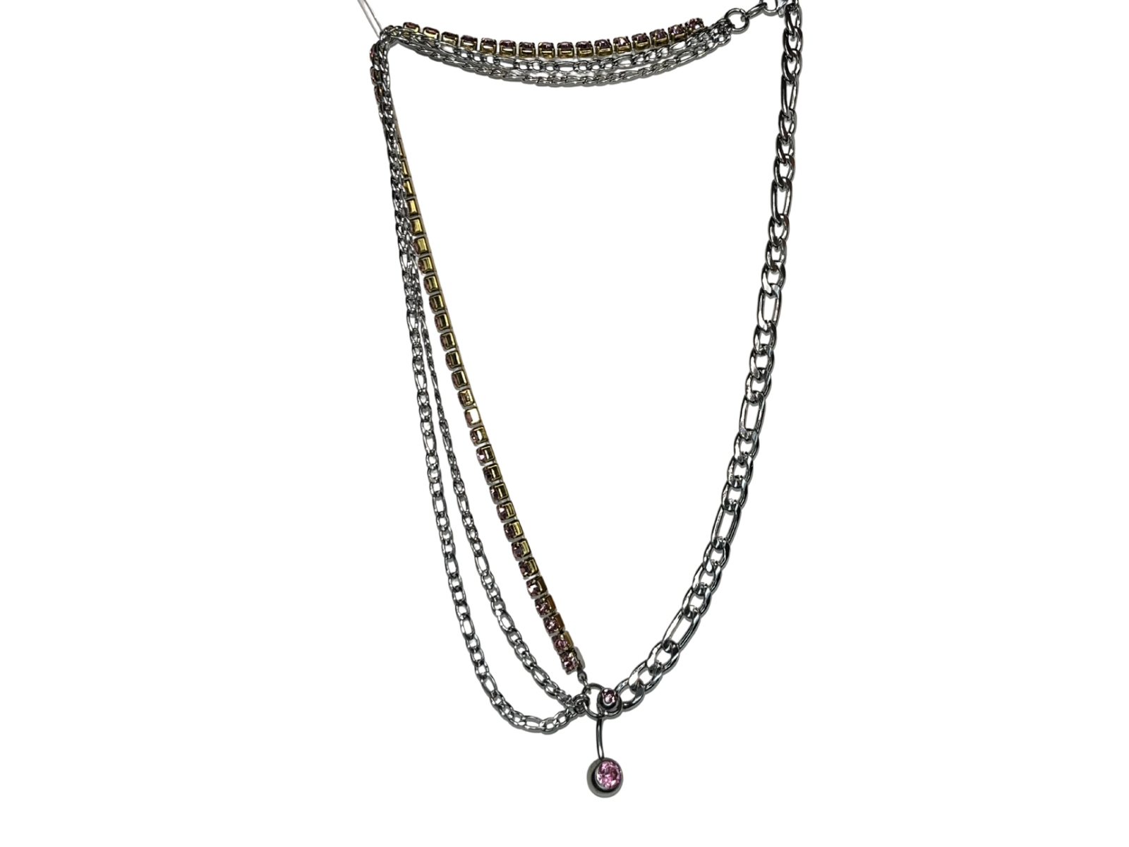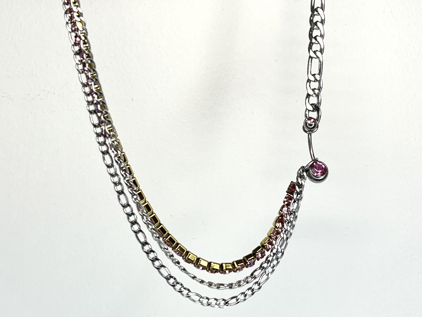 Collier en acier inoxydable asymétrique, chaine figaro en acier couleur argent et trio de chaine dont une strass rosé sur monture dorée, lié par un piercing en acier strass rose. Pièce résistante à l’eau. Possibilité de rallonge sur demande <3