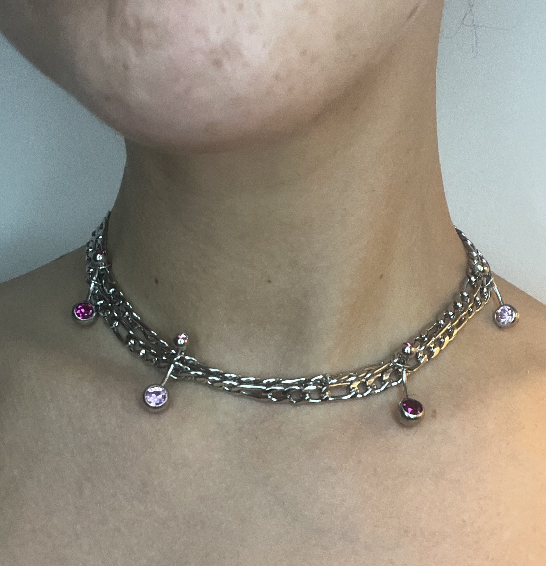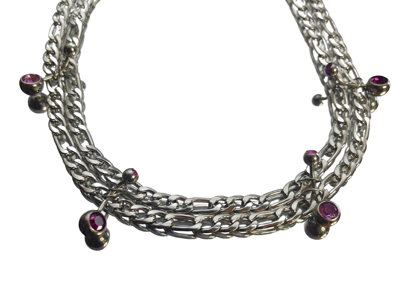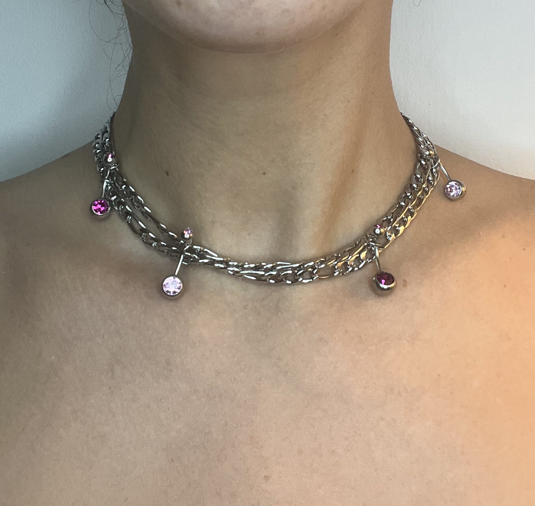 Collier en acier inoxydable argenté avec double chaine de type figaro, orné de quatre piercing de type nombril, rose foncé et clair. Ce bijou est designé et assemblé dans notre atelier au pays basque. Ce bijou habille parfaitement la tenue avec un coté « industriel » mais aussi doux et acidulé avec les strass de couleur qui rappellerais un bonbon.